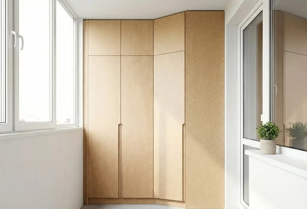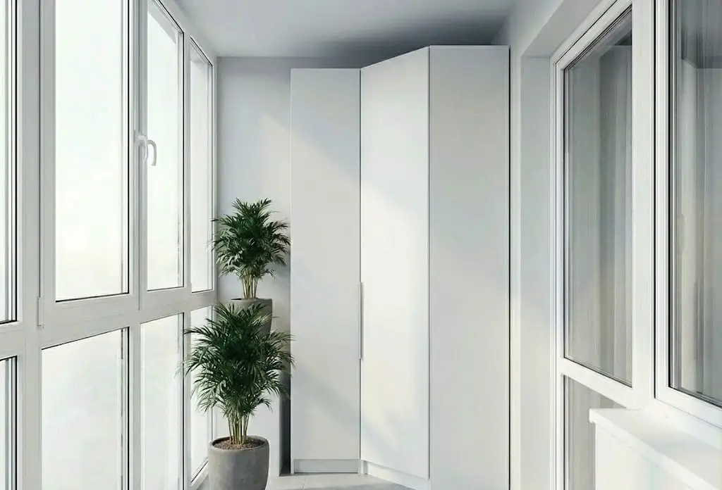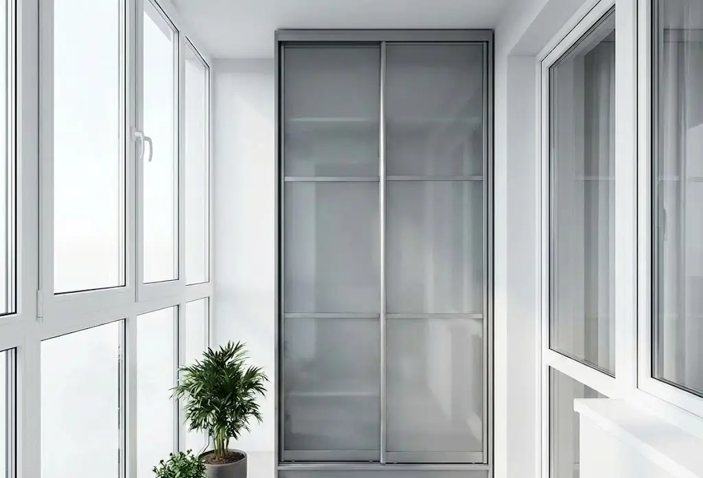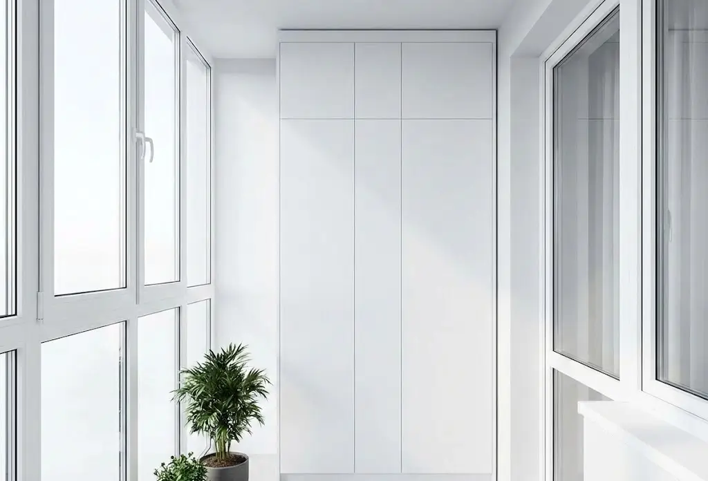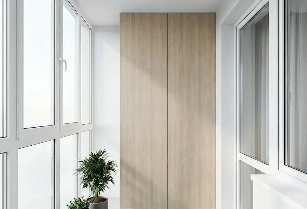 Примечание: встроенный в торец — оптимальное решение для типовых лоджий шириной 80–100 см. Занимает 40–60 см глубины, но за счёт высоты до потолка даёт значительный объём. Выбирая распашные двери ради полного доступа, жертвуют свободным пространством перед фасадом. Шкаф на лоджию на заказ с дверями-купе или складными створками экономит место, но дороже.