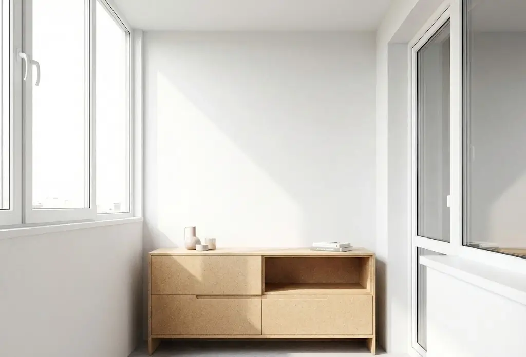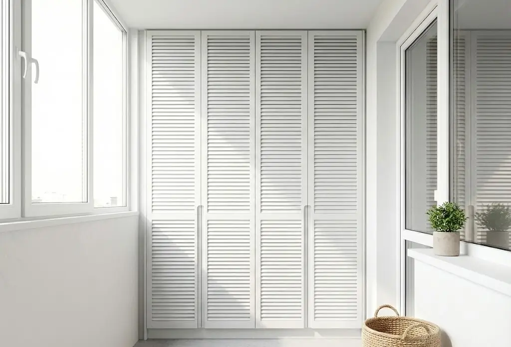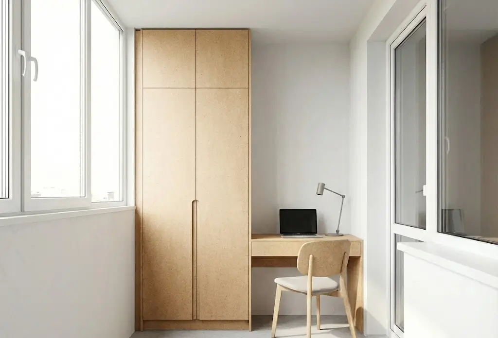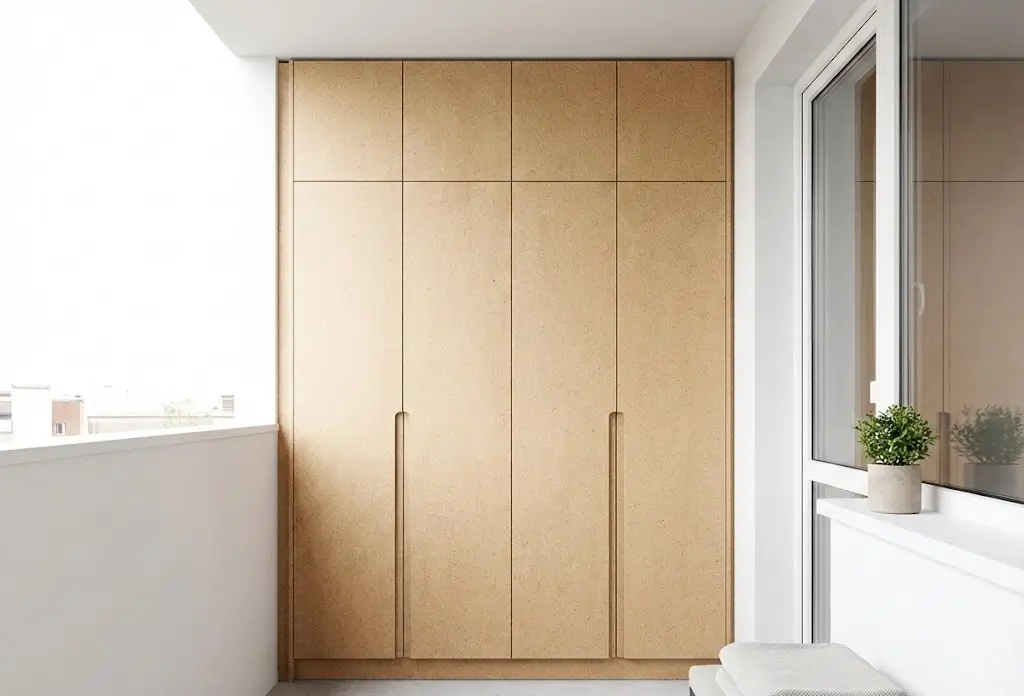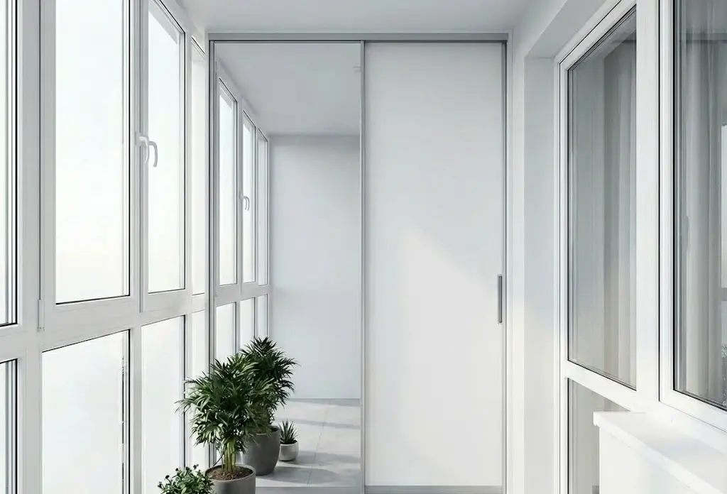Примечание: встроенный в торец — оптимальное решение для типовых лоджий шириной 80–100 см. Занимает 40–60 см глубины, но за счёт высоты до потолка даёт значительный объём. Выбирая распашные двери ради полного доступа, жертвуют свободным пространством перед фасадом. Шкаф на лоджию на заказ с дверями-купе или складными створками экономит место, но дороже.