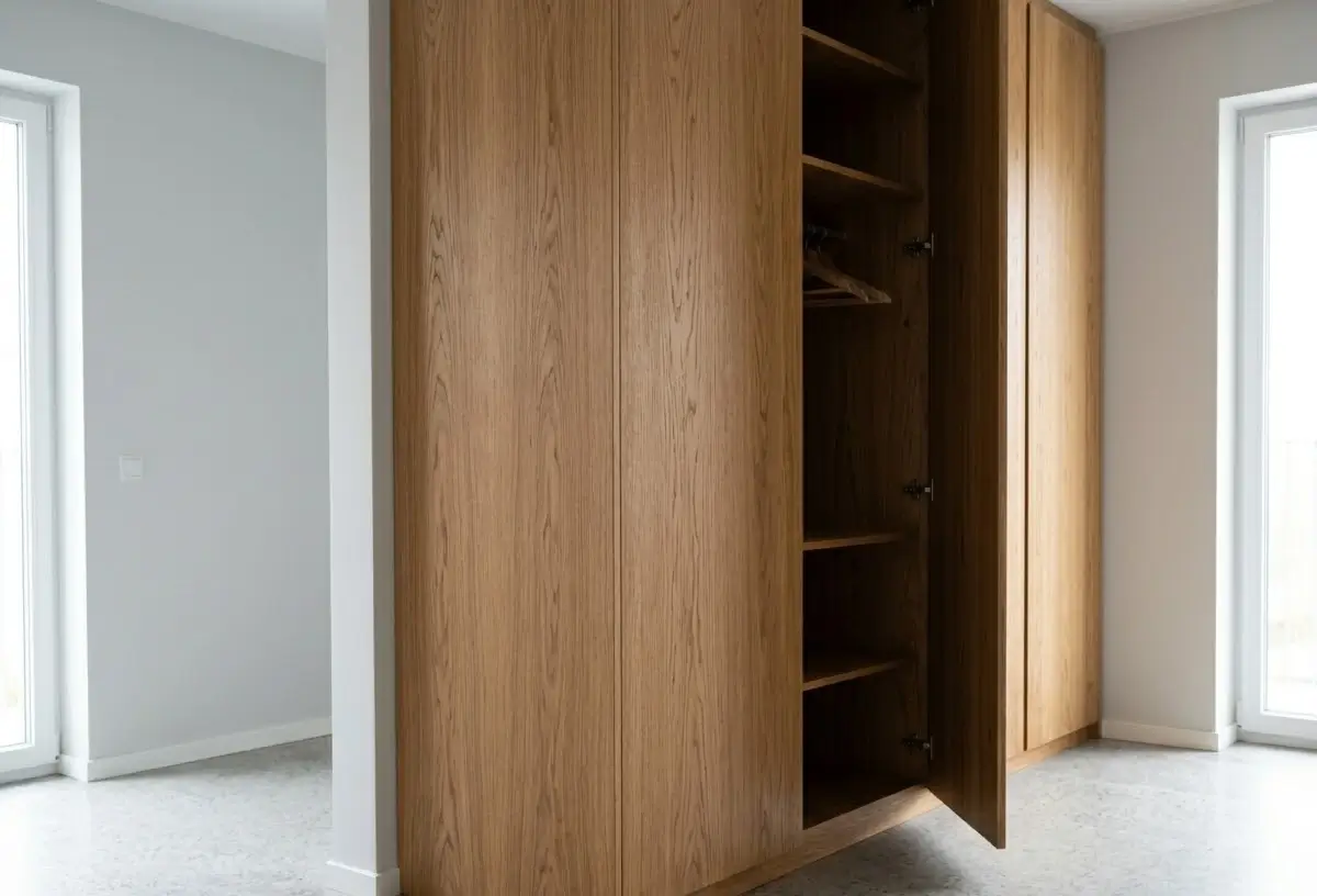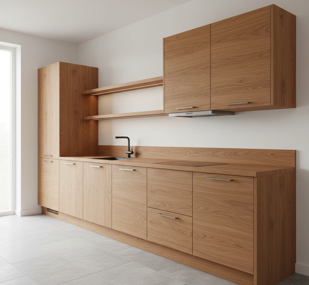 Петли и направляющие Blum/Hettich с ресурсом до 80 000 циклов. Доводчики — плавное закрывание без ударов и перекосов.