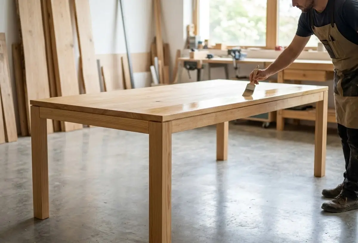 Изготовление мебели из сосны включает сушку до 8–10%, калибровку, раскрой, склейку щита (с чередованием колец), шлифовку, сборку и финишное покрытие маслом или воском.