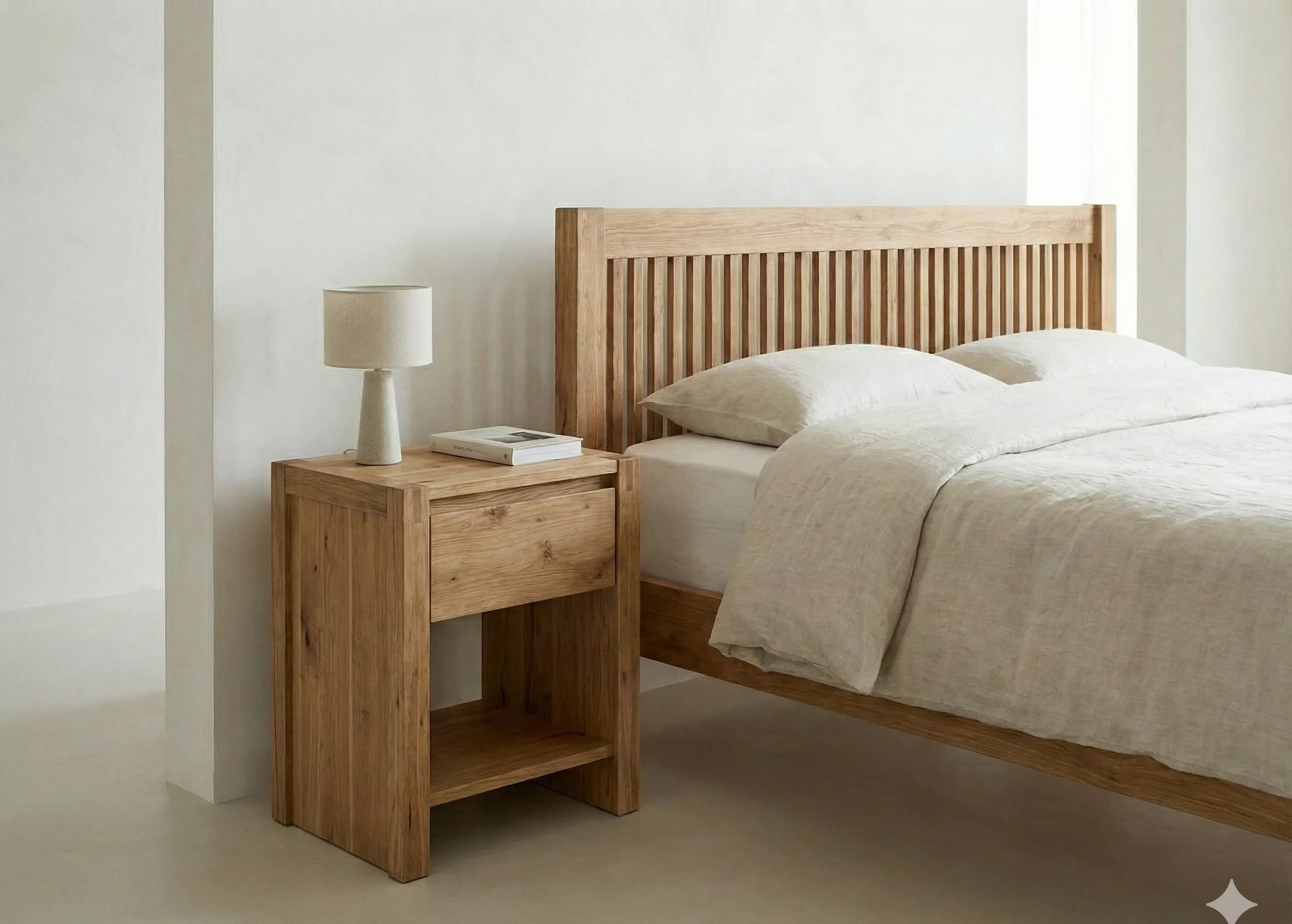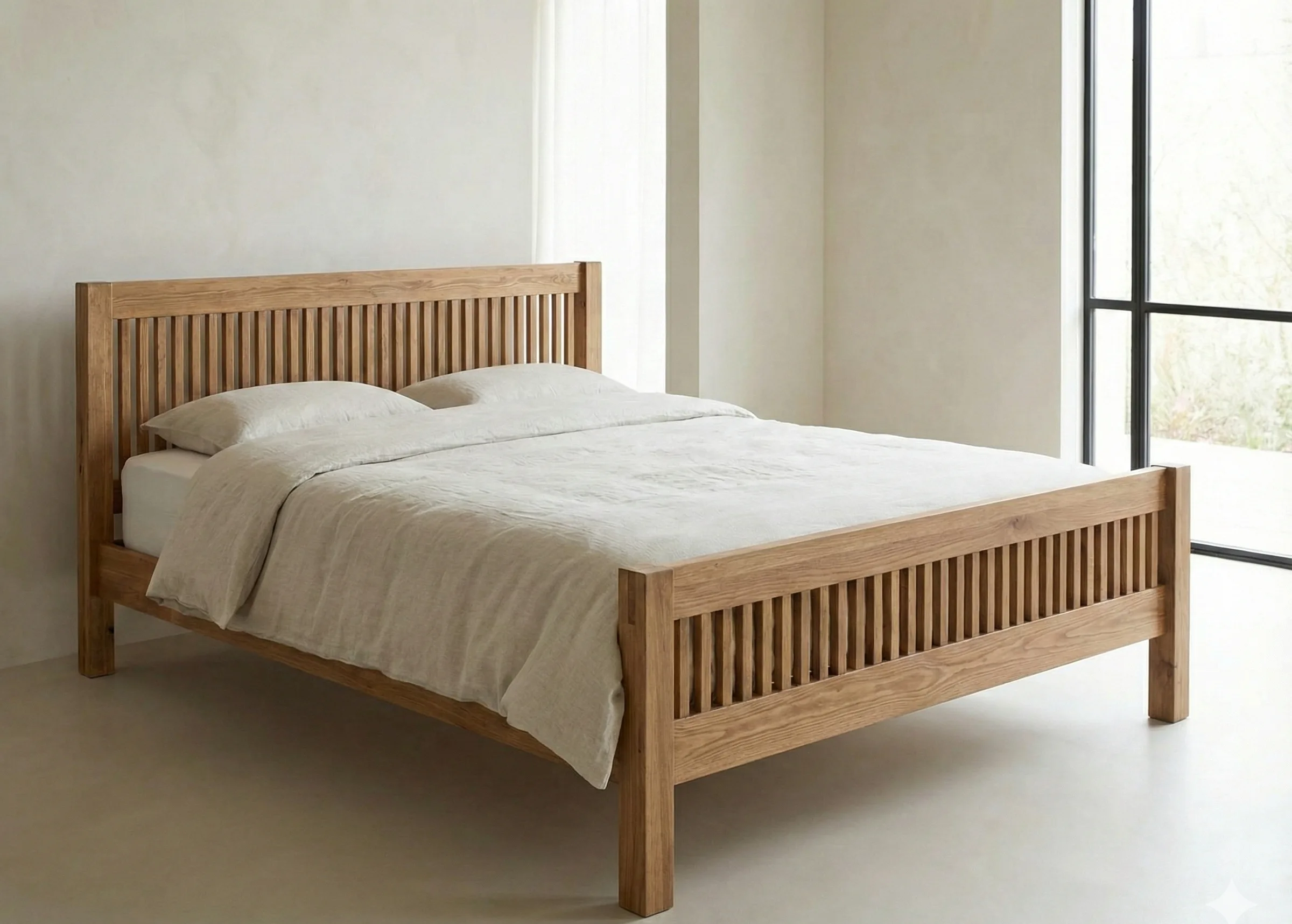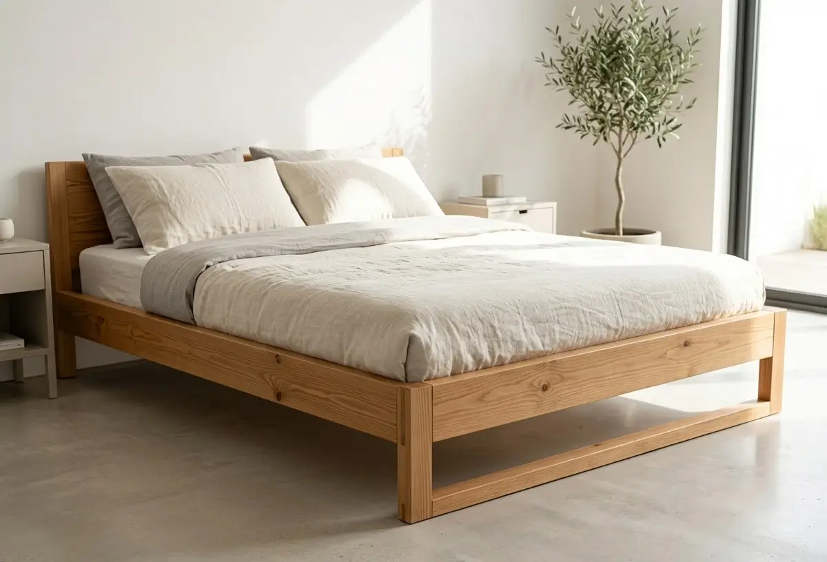 Сосна идеальна для спальных мест. На матрас нагрузка распределяется равномерно, царапины на царгах и спинках не критичны. Лёгкий вес — плюс, когда нужно передвинуть кровать.