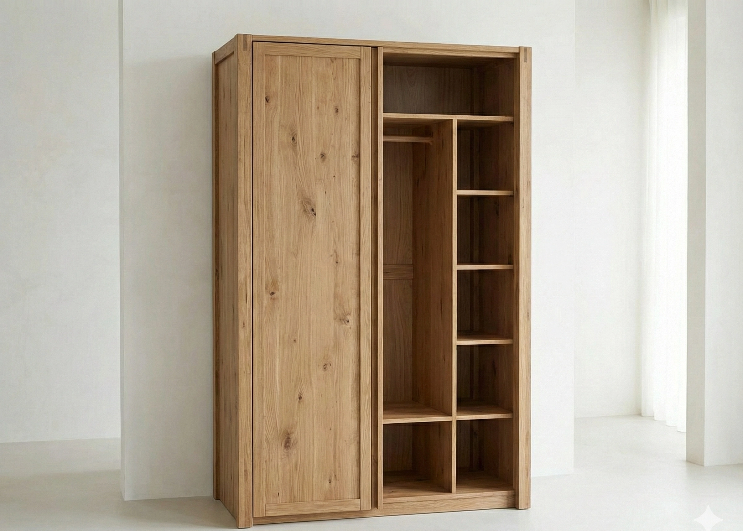 Шкаф из сосны на заказ — отличный выбор для спальни и детской. Внутренние полки и фасады из массива не выделяют вредных веществ, в отличие от ЛДСП. Но учтите: тяжёлые вещи на верхних полках лучше не хранить — сосна под нагрузкой может прогнуться, если толщина полки меньше 20–25 мм.