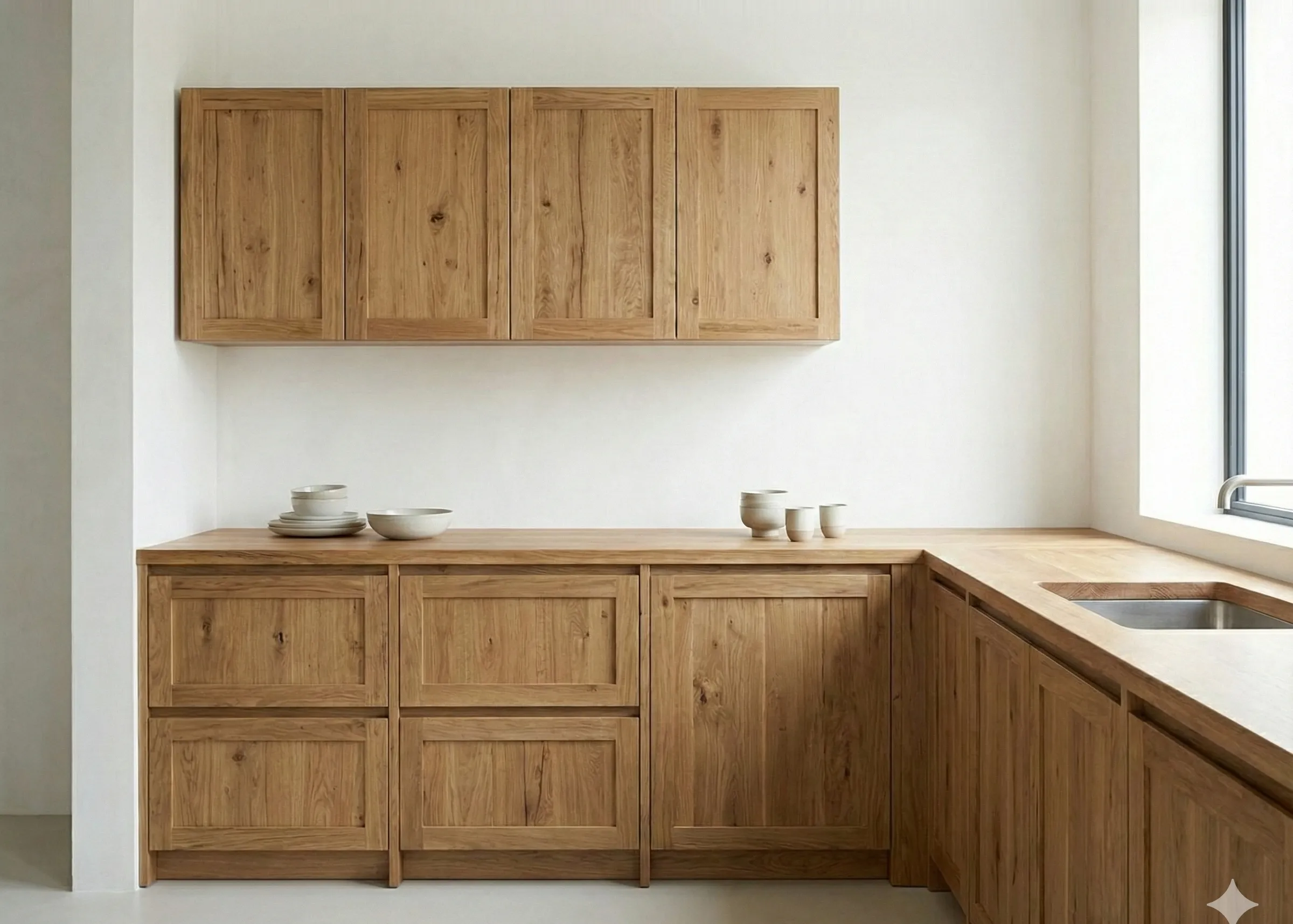 «Сосна — не для кухонных столешниц, где вы будете рубить мясо. Она помнётся. Но для фасадов кухонных шкафов, для столов в столовой — да, пожалуйста. Просто примите, что со временем появятся царапины. Это не дефект, это жизнь дерева. Их легко убрать шлифовкой и маслом. Лакированная сосна — не наш вариант, лак трескается, и царапину не зашлифовать локально».