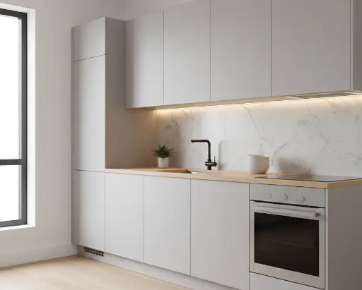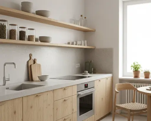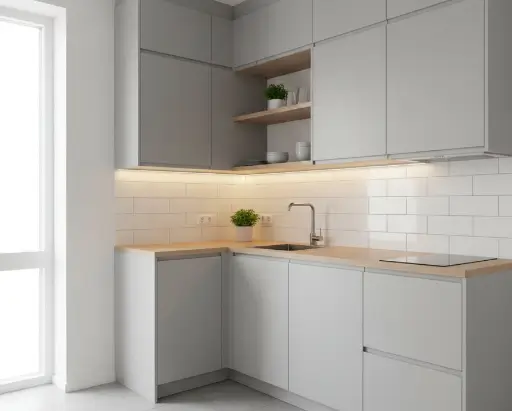 В типовых «хрущёвках» и малосемейках Бишкека площадь редко превышает шесть квадратов. Классический прямой ряд с глубиной 60 см сделает комнату ещё теснее. Выход — угловая планировка с использованием «мёртвых» зон: место под окном для мойки или рабочей поверхности, выдвижные полки в цоколе, навесные шкафы до потолка. Также мы часто уменьшаем глубину нижних секций до 50 см — тогда проход становится шире, а кастрюли всё равно помещаются. И никогда не ставим на маленькую кухню высокий пенал, если его можно заменить на два узких открытых стеллажа. Ещё один приём: заказывать столешницу с переменной глубиной — у мойки шире, у входа уже.