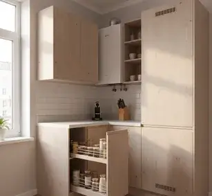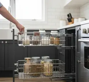 Рекомендация: Для кухни, которой пользуются каждый день, не экономьте на выкатной системе. Механизмы полного выдвижения стоят дороже, но превращают бесполезный стык в самое вместительное место гарнитура. Карусель — бюджетный компромисс: доступ лучше, чем у глухих дверец, но высокие бутылки и кастрюли в ней не поставишь.