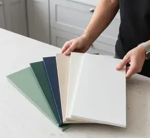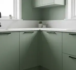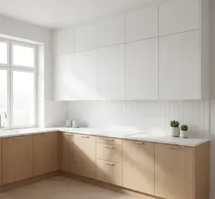 Применяем МДФ плиты Egger и AGT с PUR-клеевым швом. Фасады выдерживают влажность до 80% и нагрев до 90°C, что предотвращает отслоение пленки возле духового шкафа.
