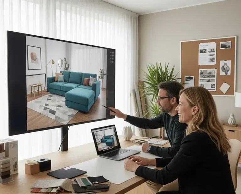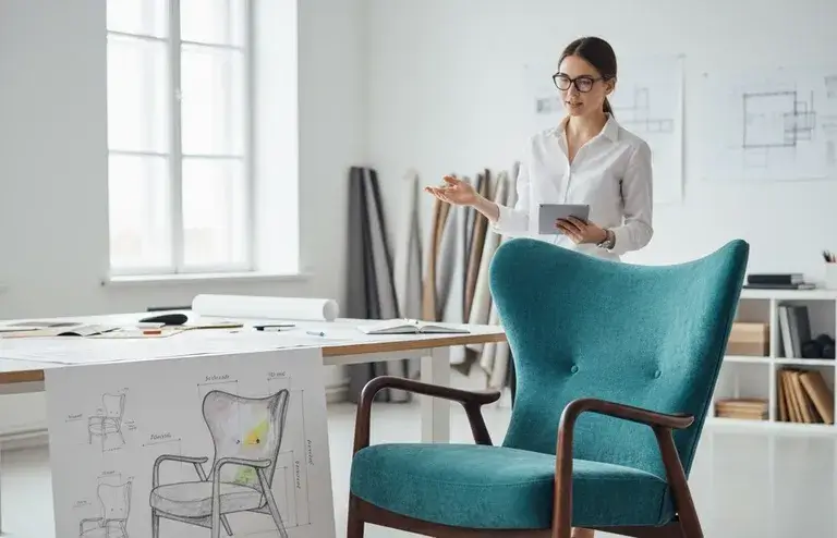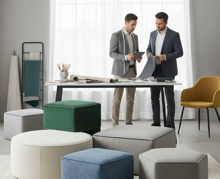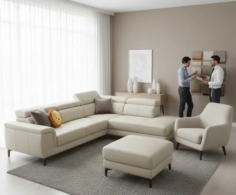 Подбираем обивку под детей и животных: антикоготь, водоотталкивающая пропитка, лёгкая чистка. Образцы привозим на объект для подбора под освещение.
