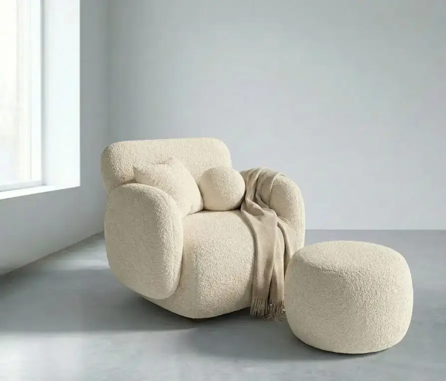 Спальня. У изножья кровати или у окна формирует приватную зону для утреннего кофе. Мягкие, обволакивающие формы и тактильные полотна — велюр, букле — создают уют.