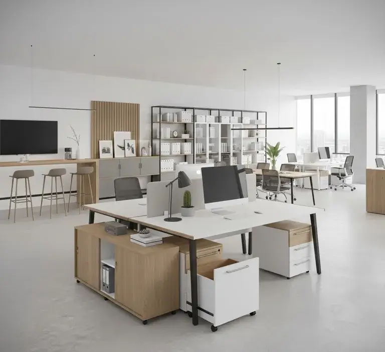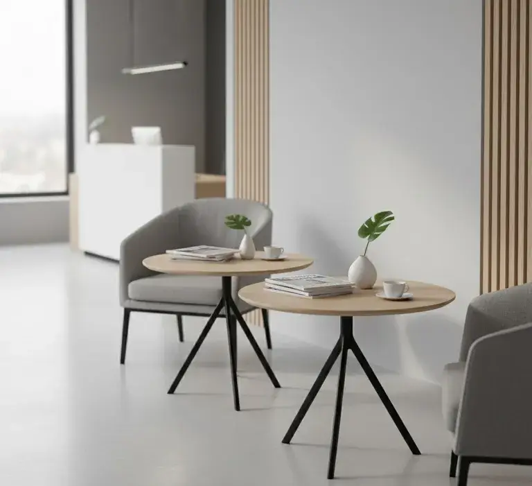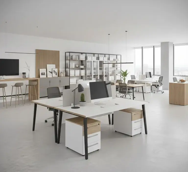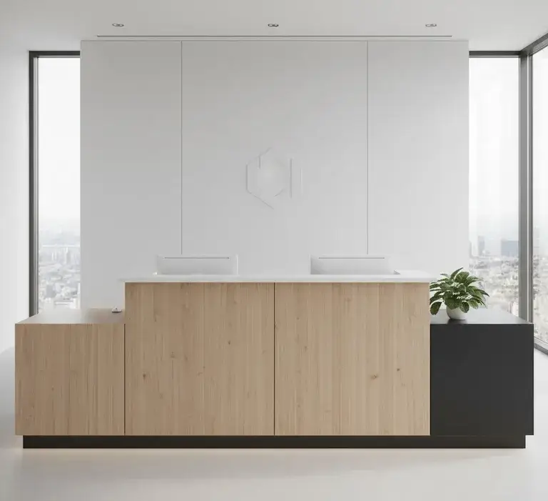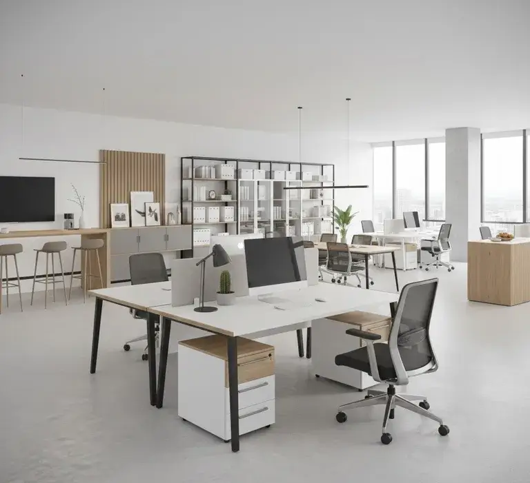 «При выборе цвета столешниц для опенспейса избегайте чисто белого и глянцевого. Белый даёт блики, от которых устают глаза, особенно при верхнем люминесцентном освещении. Глянец собирает отпечатки и выглядит неопрятно уже к обеду. Оптимальный выбор — светло-серый, бежевый или текстура дерева с матовым покрытием. Глаза меньше напрягаются, а поверхность дольше сохраняет презентабельный вид».