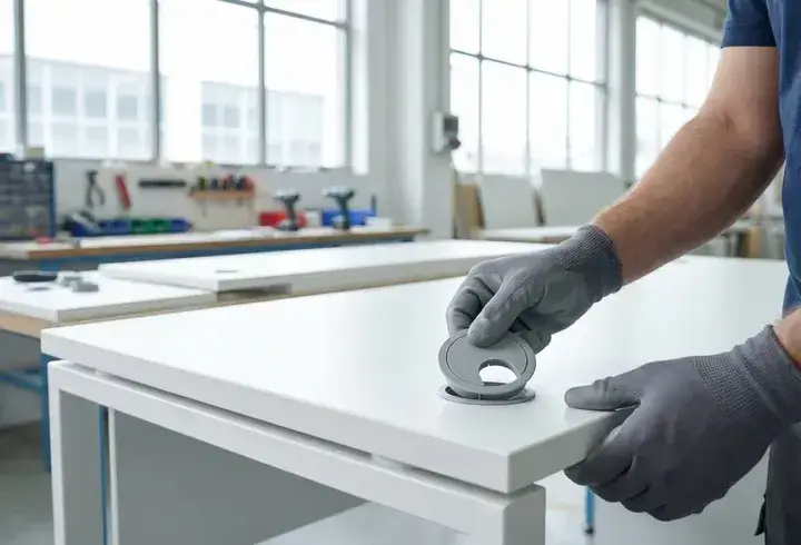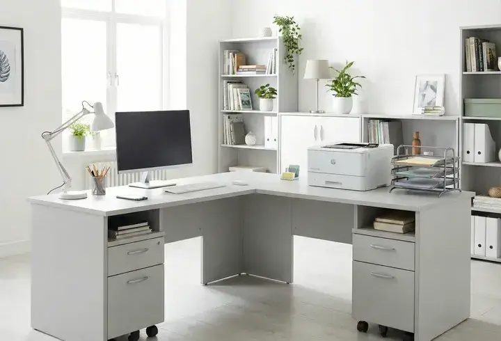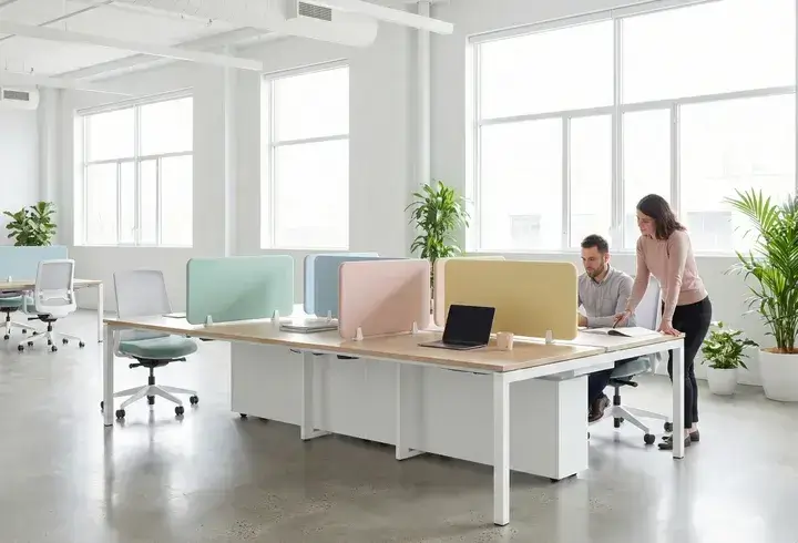 «При выборе цвета столешниц для опенспейса избегайте чисто белого и глянцевого. Белый даёт блики, от которых устают глаза, особенно при люминесцентном освещении. Глянец собирает отпечатки и выглядит неопрятно уже к обеду. Оптимум — светло-серый, бежевый или текстура дерева с матовым покрытием».