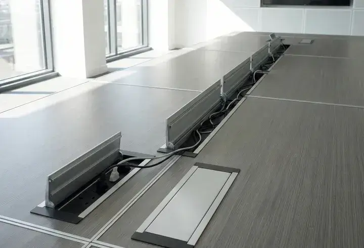 | Горизонтальные лотки под столешницей | Скрытая прокладка, питание группы столов | Металлические, разделение на силовые и слаботочные |