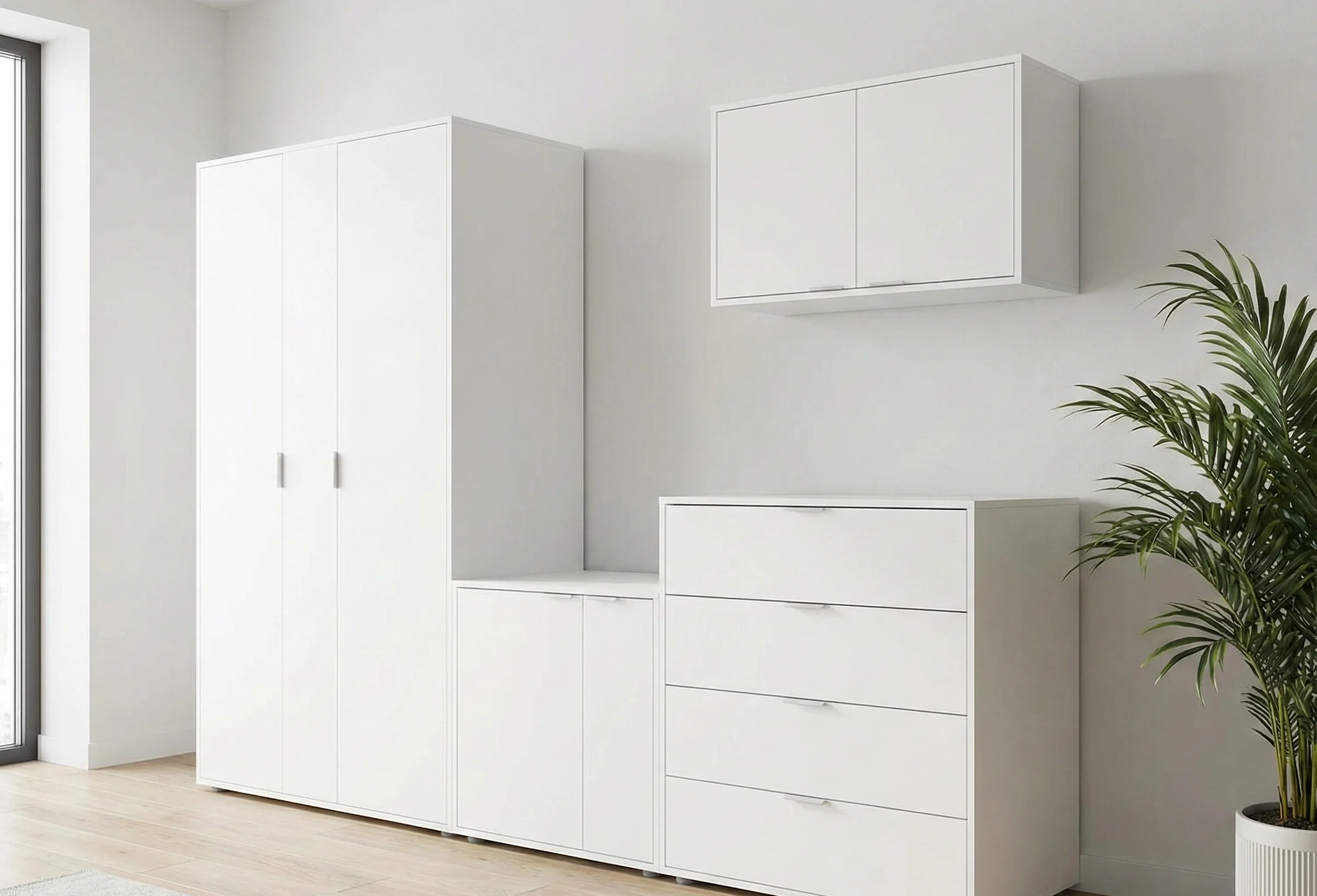 Ко мне в мастерскую пришёл клиент из Бишкека. У него была ниша шириной 2,4 м. Он хотел три секции с распашными дверями. Я предложил ширину дверей 80 см (три по 80 см = 2,4 м). Но при открывании крайние створки упирались бы в боковые стены. Решение — сделать две секции: одну шириной 100 см, другую 140 см, с двумя дверцами на широкой секции. При заказе вы определяете количество секций, ширину каждой дверцы, тип петель, материал фасадов и внутреннее наполнение (полки, штанги, ящики). Выбирая индивидуальный проект, вы жертвуете временем (2–3 недели), но получаете идеальную посадку.