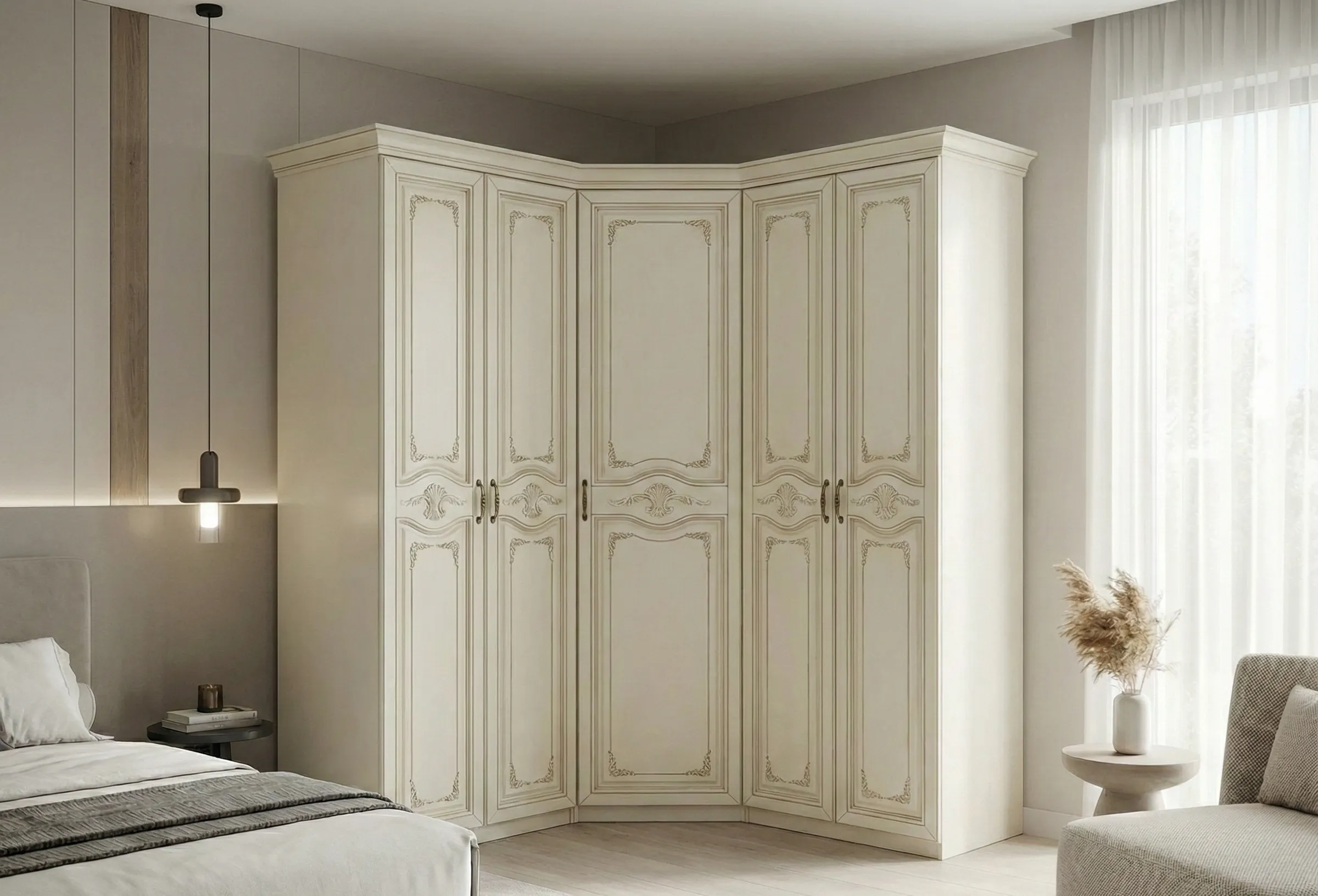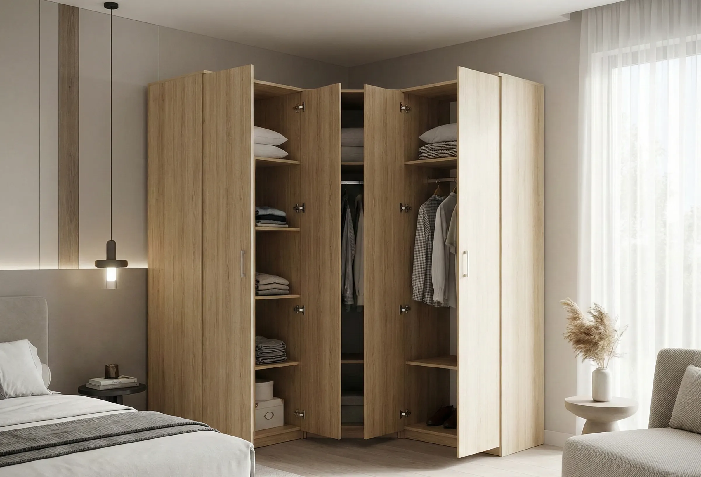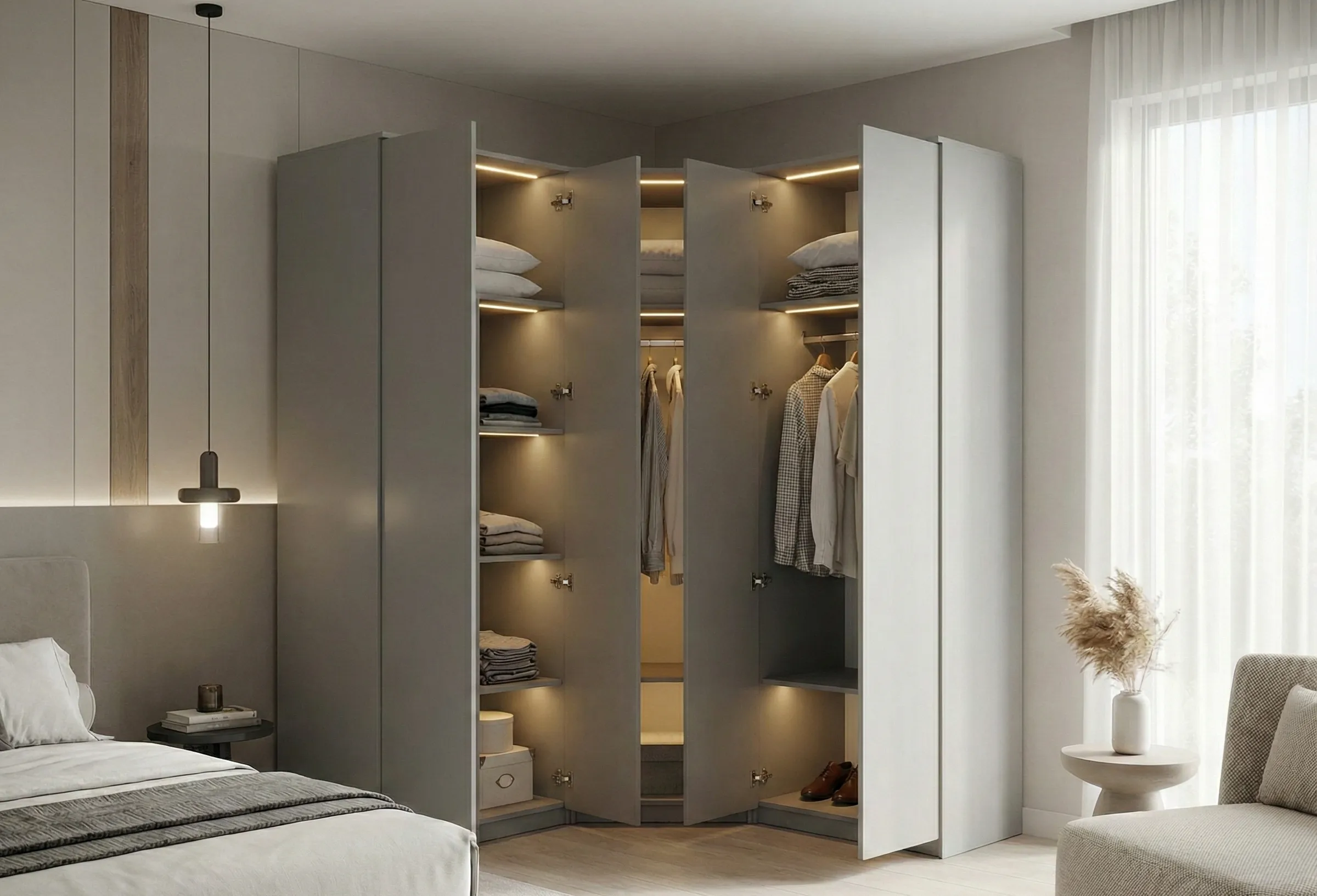 Ключевой тезис: Угловой шкаф позволяет задействовать пространство, которое иначе остаётся неиспользуемым, и при той же занимаемой площади стены даёт на 20–30% больше внутреннего объёма.