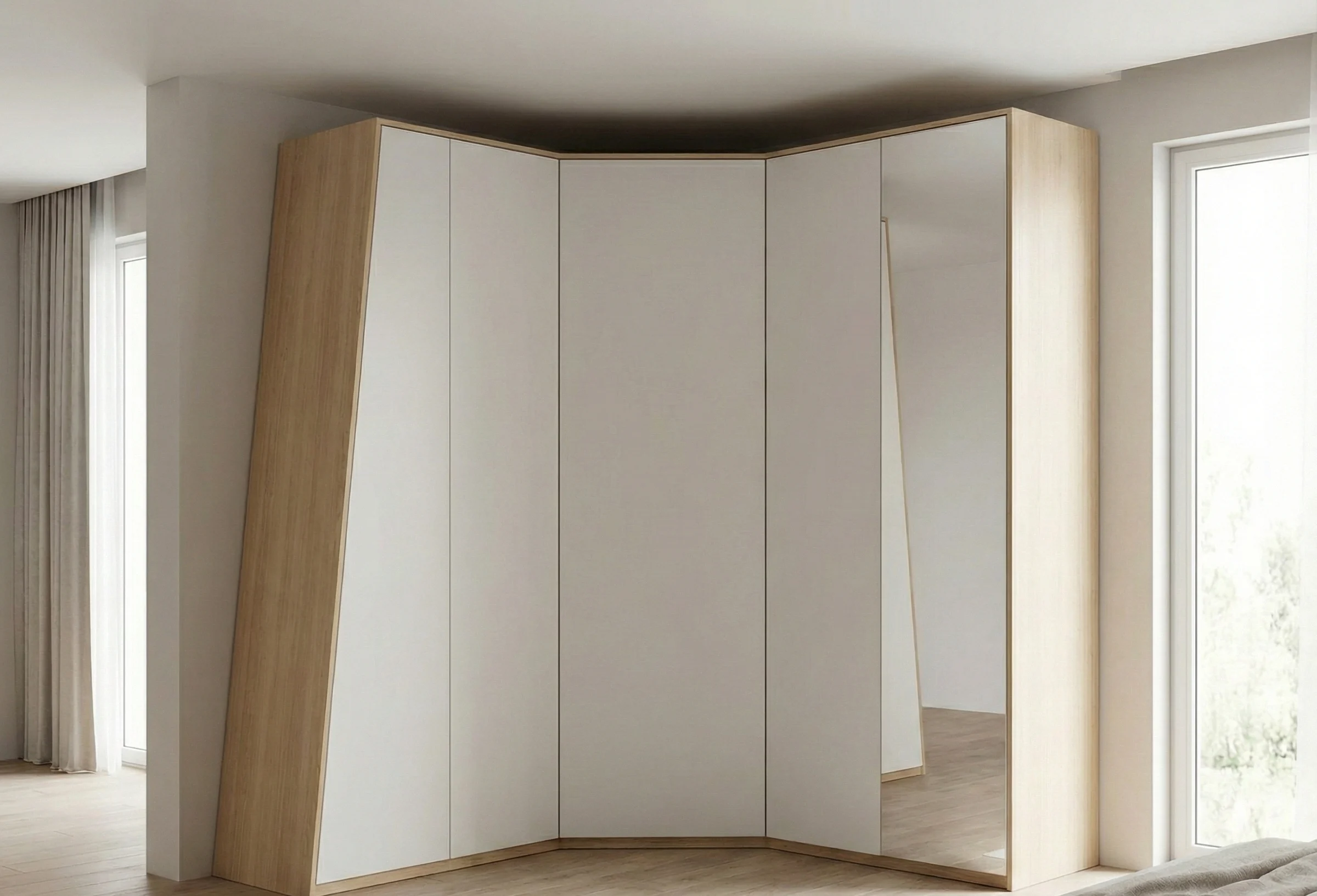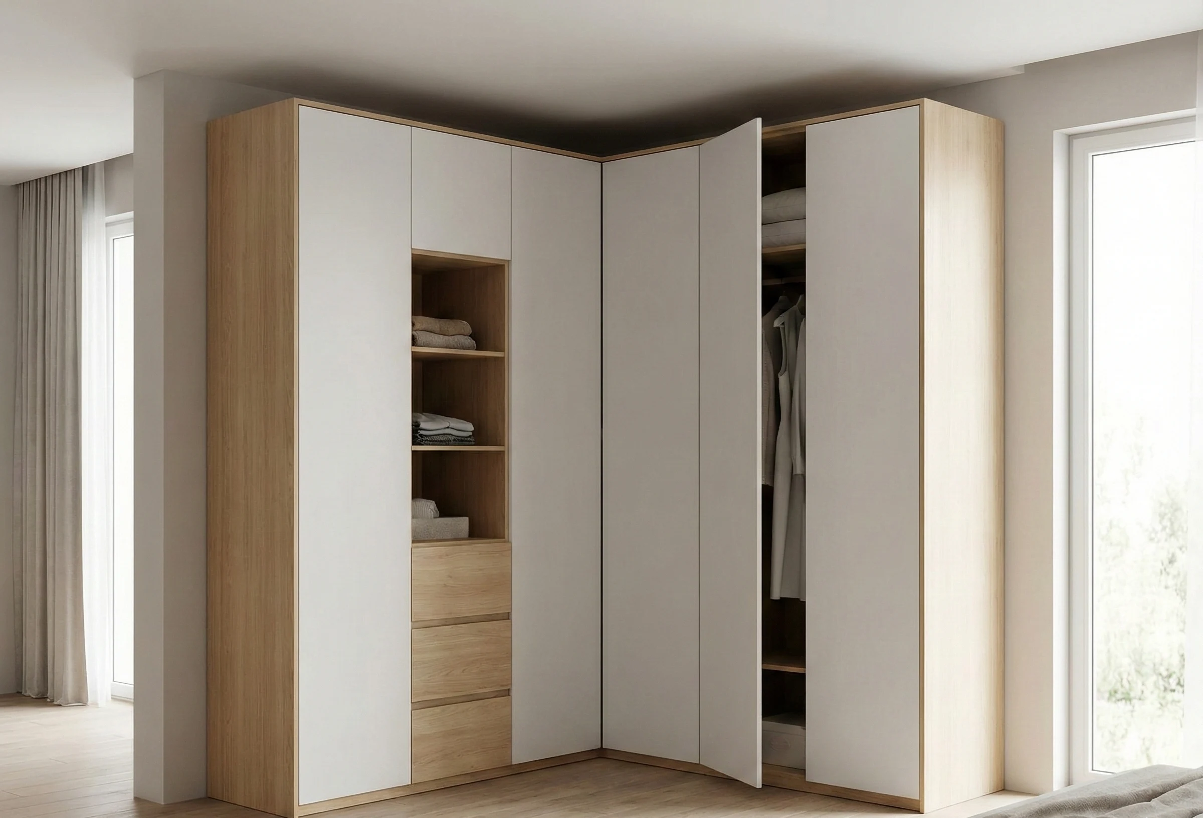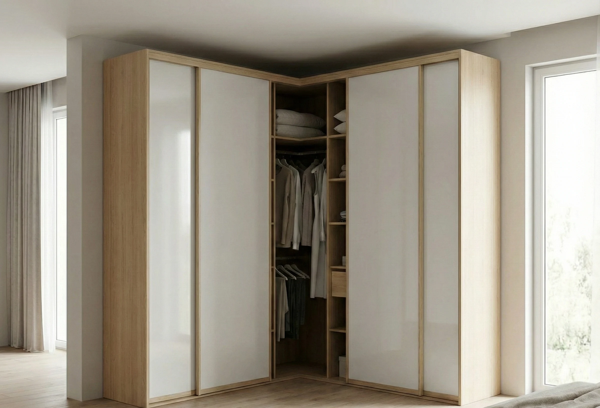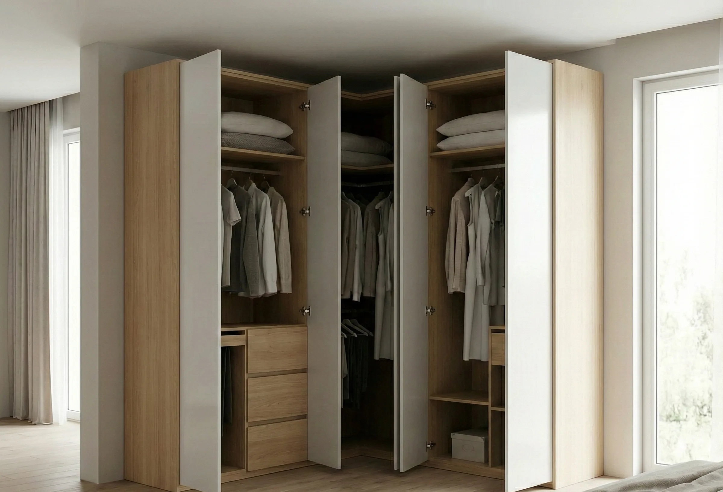 Совет эксперта от Амана Турсунова: «В угловом шкафу всегда делайте одну из секций (ту, что ближе к входу) с распашными дверцами, а не раздвижными. Так вы получите быстрый доступ к самым нужным вещам. Раздвижные двери оставьте для длинных сторон. Проверено на сотнях проектов».