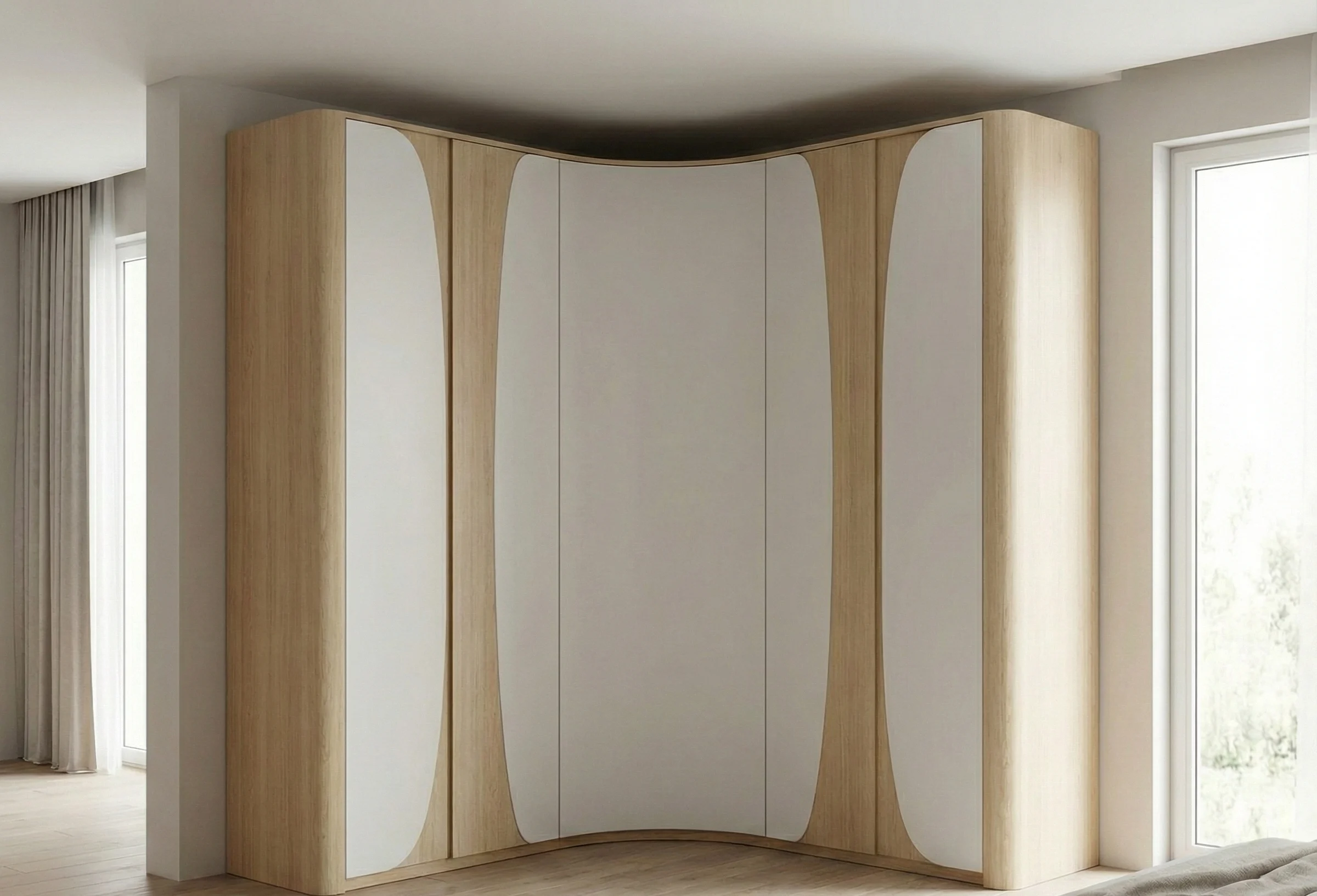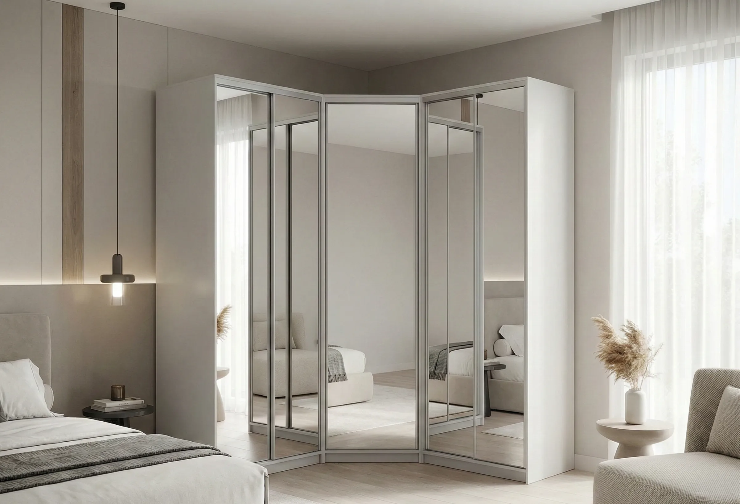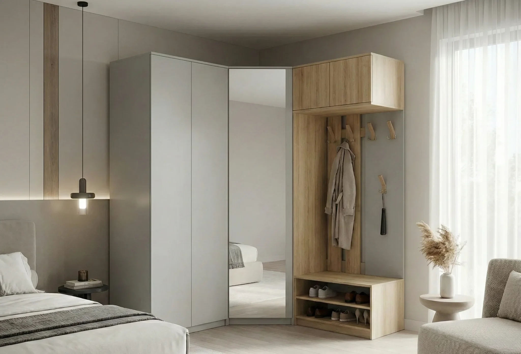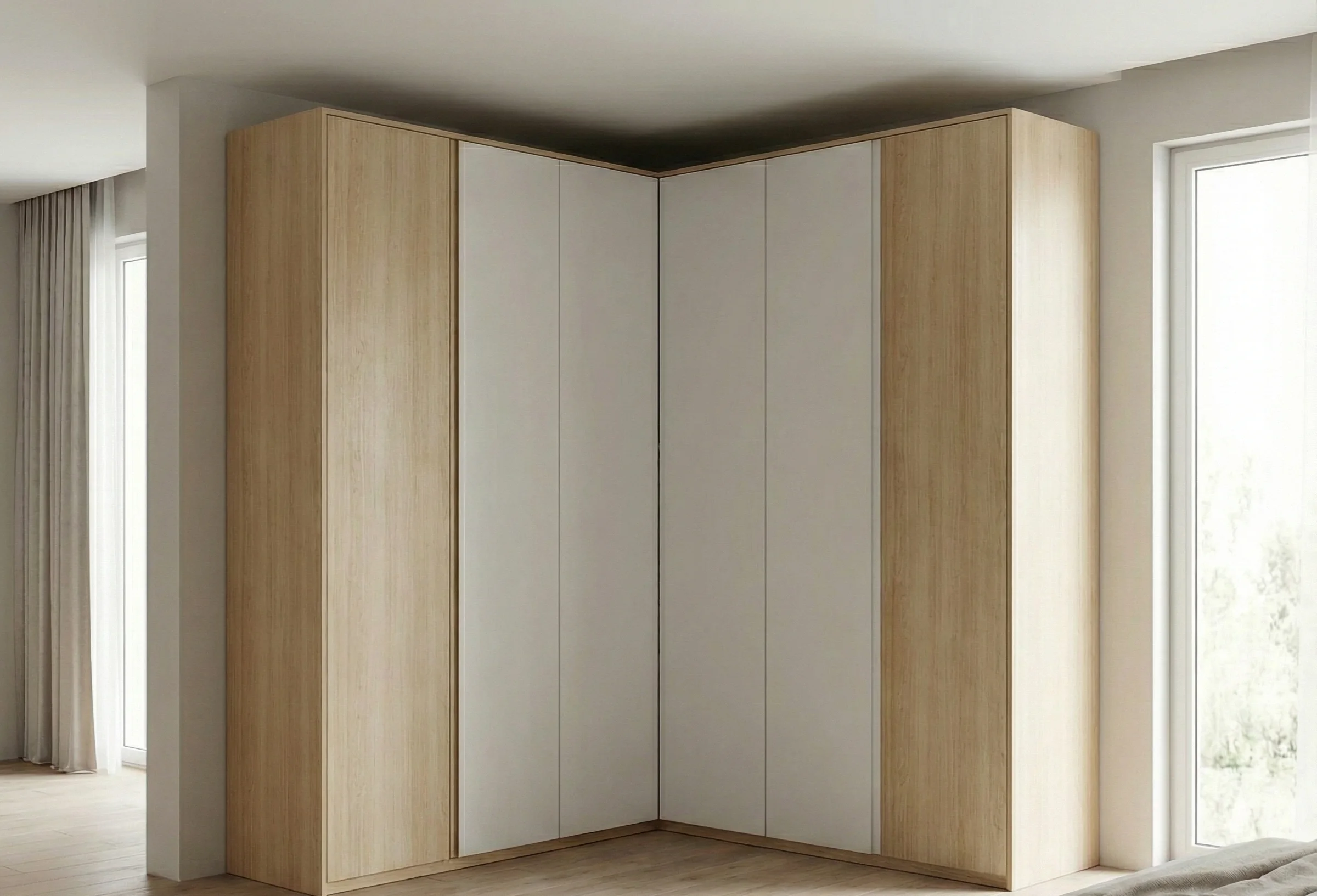 Совет эксперта от Амана Турсунова: «В угловом шкафу всегда делайте одну из секций (ту, что ближе к входу) с распашными дверцами, а не раздвижными. Так вы получите быстрый доступ к самым нужным вещам. Раздвижные двери оставьте для длинных сторон. Проверено на сотнях проектов».