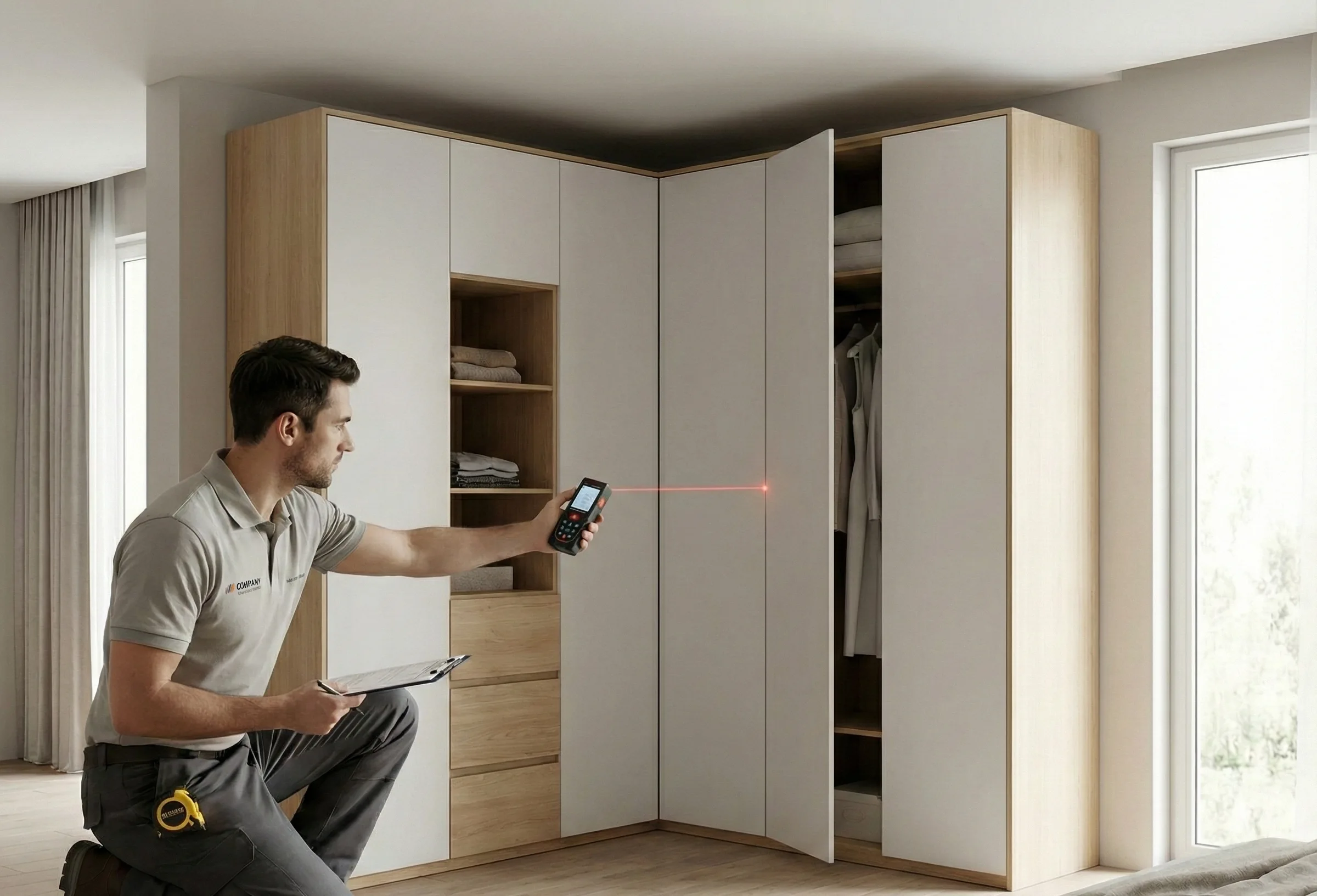Применяем лазерное оборудование Bosch, что исключает зазоры между шкафом и стенами. В 98% случаев установка проходит без лишней пыли и подгонки деталей на месте за 1 день.