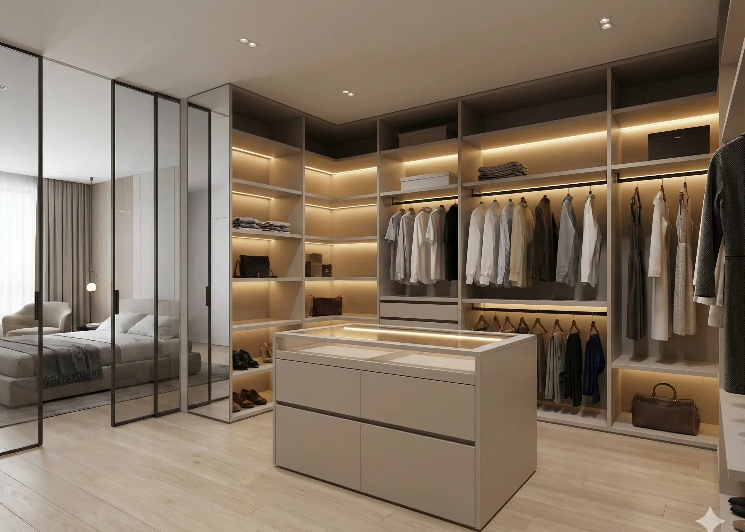 Совет эксперта от Азамата Исакова: «При заказе встроенного шкафа обязательно предусмотрите съёмные панели или лючки в местах прохождения коммуникаций — труб, розеток, выключателей. Если зашить всё наглухо, при любой аварии придётся ломать мебель. Съёмная панель стоит копейки, но спасает от больших проблем».
