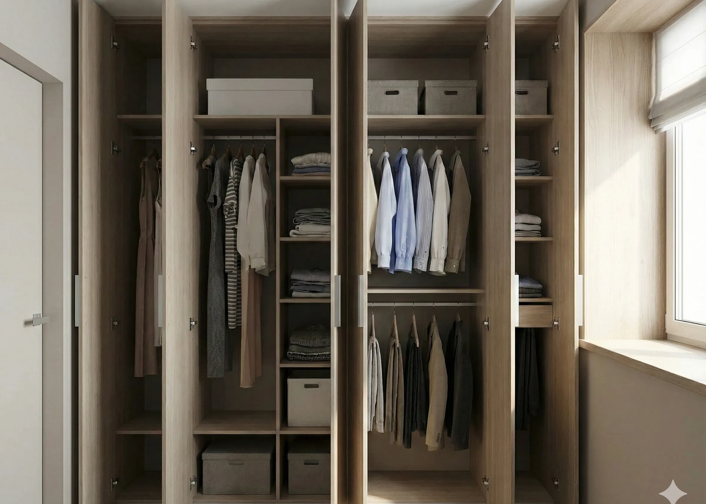 Проектируем ниши под пылесос, гладильную доску или чемоданы. 9 из 10 клиентов выбирают скрытые секции, чтобы убрать бытовые предметы из зоны видимости гостей.