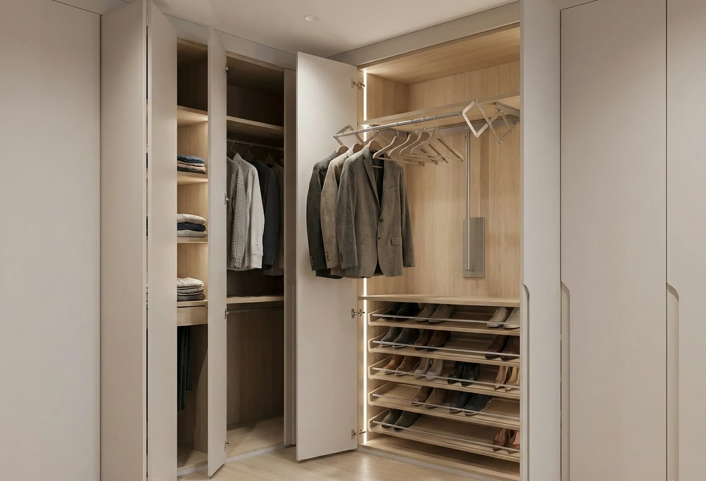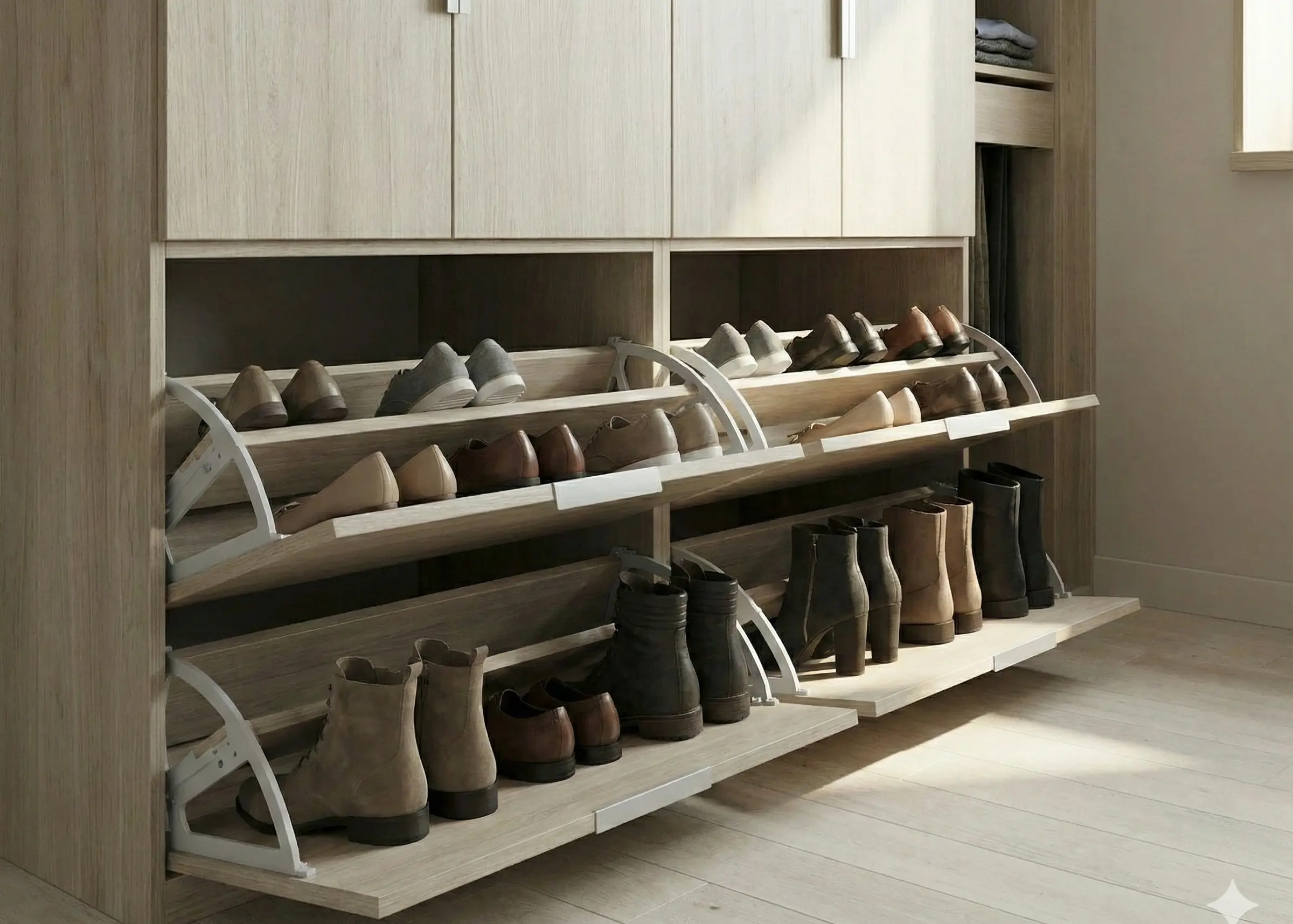 Интегрируем сетчатые полки и обувницы-слимы. Это позволяет разместить на 60% больше обуви на той же площади, полностью освобождая пол прихожей от загромождения.