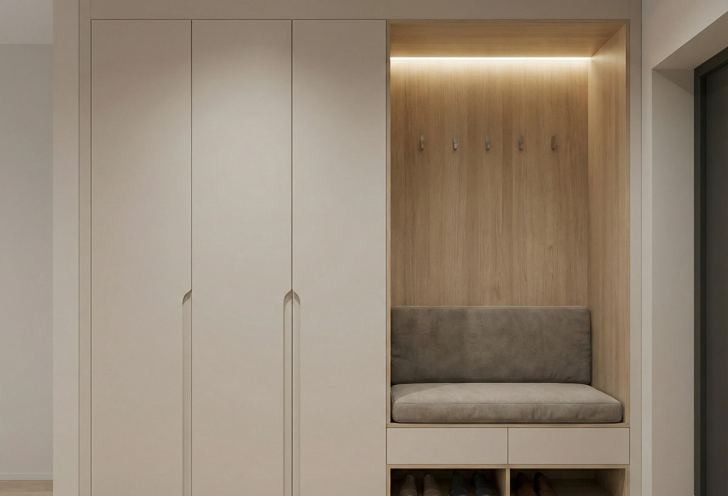 Ключевой тезис раздела: Двадцать лет назад прихожая в Бишкеке представляла собой набор случайной мебели: вешалка-стойка, тумбочка для обуви и зеркало в раме. Сегодня это единая встраиваемая конструкция с продуманными зонами для верхней одежды, обуви, аксессуаров и хранения сезонных вещей.