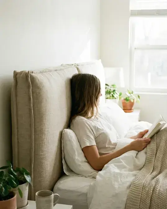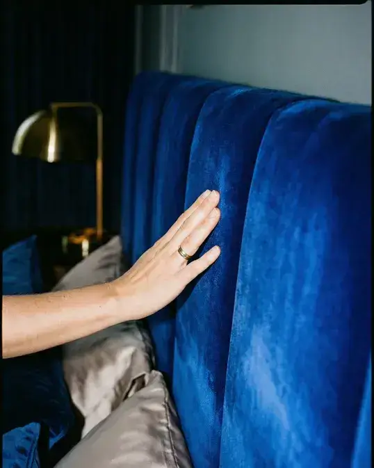 - Природные оттенки. Бежевый, терракотовый, пыльная олива, глубокий синий, тёплый серый — успокаивают и способствуют здоровому сну.