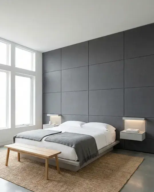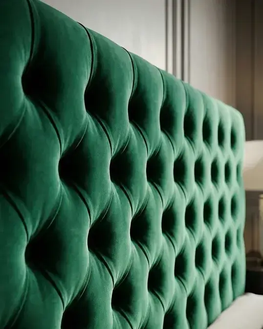 - Высокие вертикальные плоскости. Панели 140–160 см, обитые велюром или шениллом приглушённых тонов, создают ощущение кокона. Вертикальная стёжка зрительно поднимает потолок.