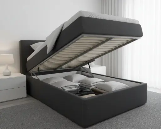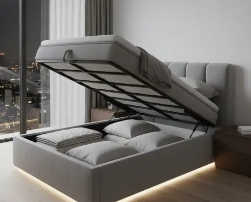 - Встроенное хранение. Газлифт с вместительным ящиком — must-have для малогабаритных квартир.