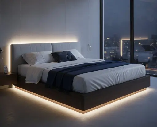 - Парящие конструкции. Модели на скрытых ножках или с подсветкой по периметру создают эффект невесомости.