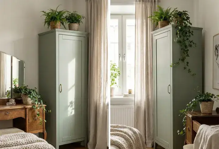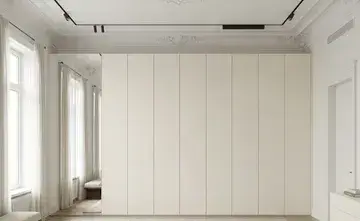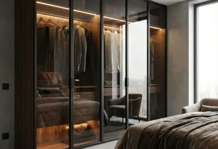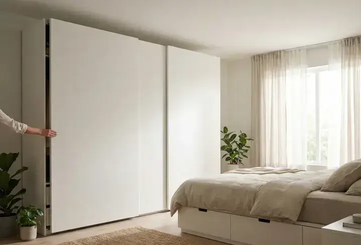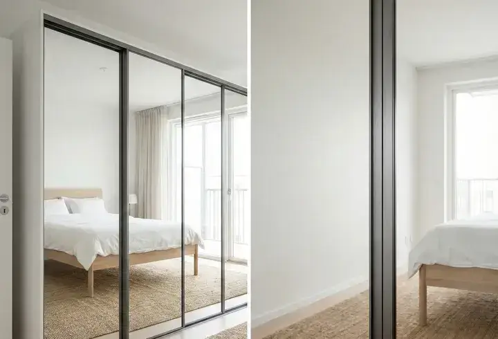 Купе — находка для малогабариток. Раздвижные створки не «съедают» площадь, позволяя ставить предмет вплотную к другой обстановке. Механизм направляющих забирает 8–10 см полезной глубины.
