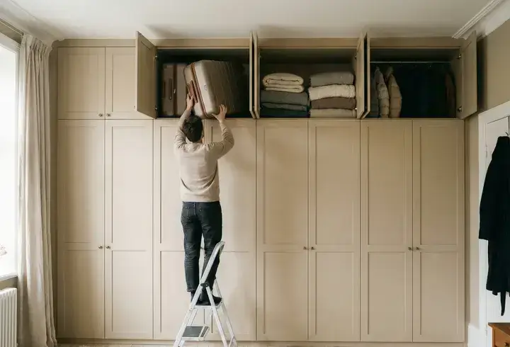 - Максимальная вместительность. Шкафы в спальню на заказ проектируются до потолка, задействуя всю высоту и давая до 30% дополнительного объёма для сезонных вещей и чемоданов.