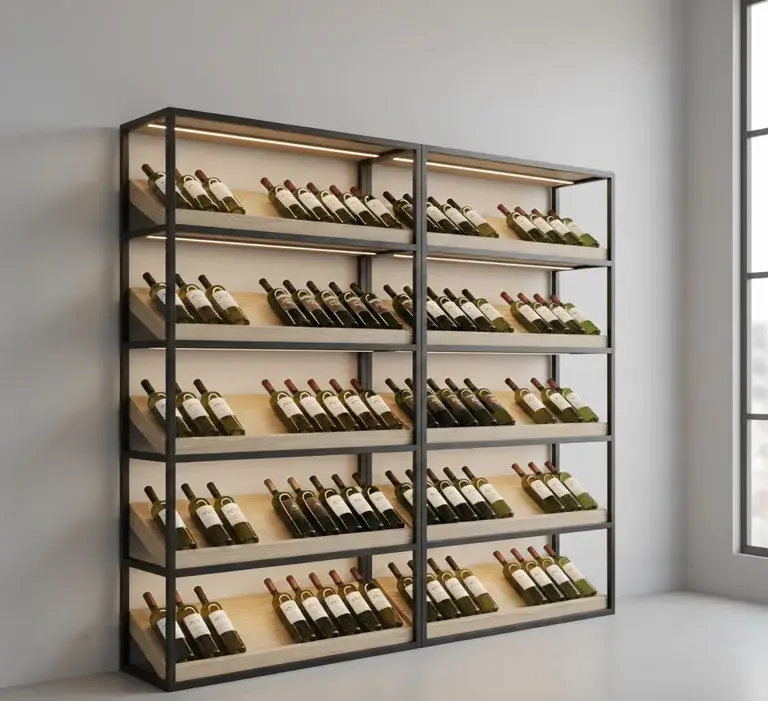 Специализированные стеллажи для хранения винных бутылок с правильной фиксацией.
