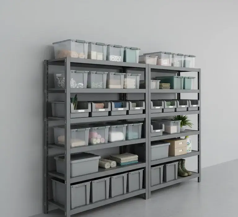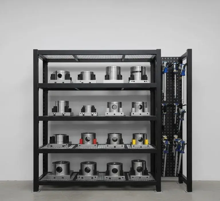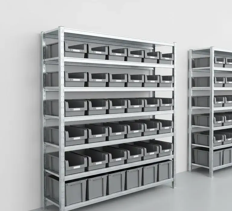 Стеллажи с разделением на секции под разные категории товаров или инструментов.