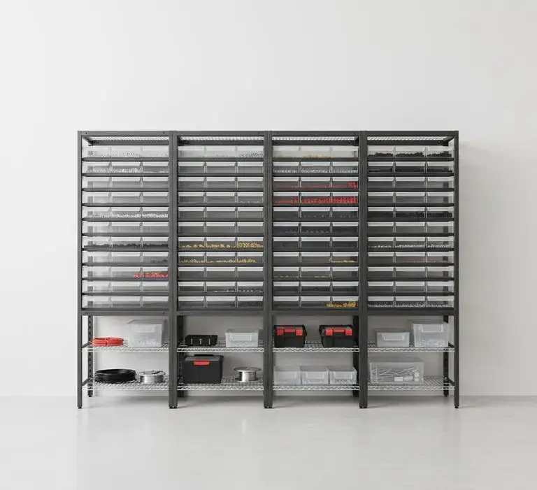 Удобные стеллажи для хранения мелких деталей, крепежа и комплектующих.