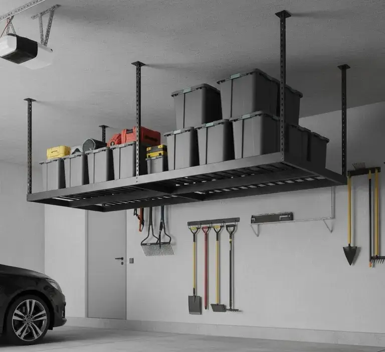 Стеллажи, крепящиеся к потолку, для рационального использования верхнего пространства.