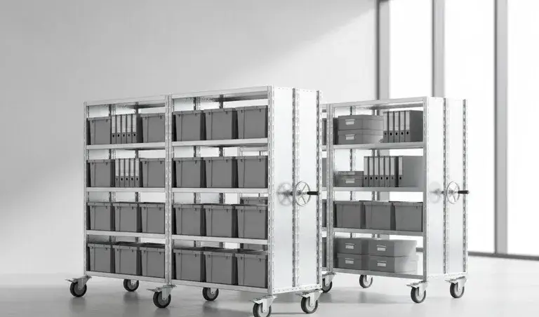 Стеллажи на колесах для удобного перемещения и быстрой смены планировки.