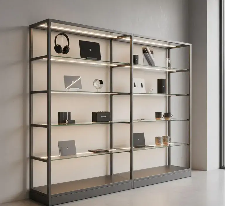 Торговые стеллажи с открытыми полками, стеклом и подсветкой для демонстрации товаров.