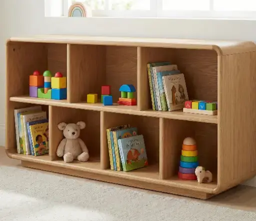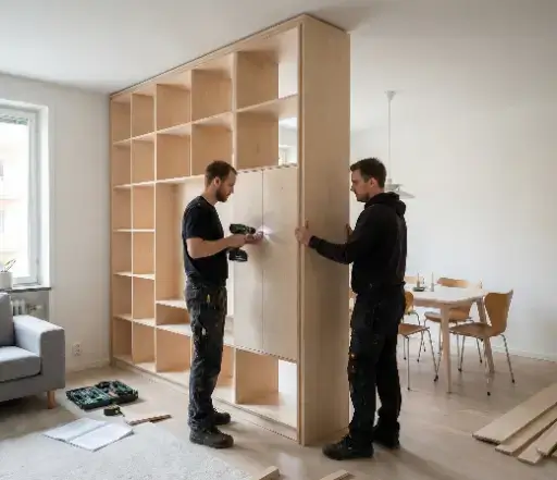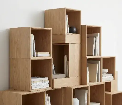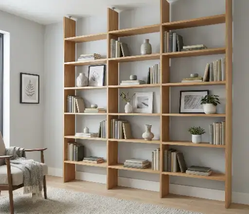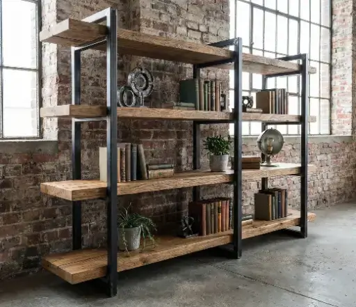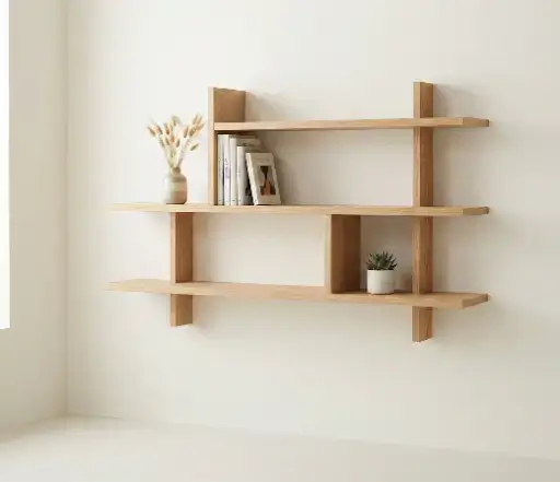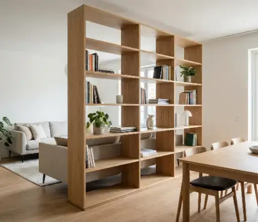 Стеллаж-перегородка для квартиры-студии. Сквозная конструкция, которая зонирует пространство, но не перекрывает свет. Здесь важна двусторонняя эстетика — задней стенки нет, обе стороны лицевые. Порода может быть любой под бюджет, но я рекомендую вертикальные стойки из массива, а полки — из мебельного щита. Так конструкция будет стабильной, но не слишком тяжёлой.