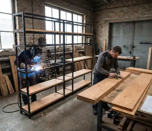 Изготовление стеллажа с нуля в нашей мастерской — это пять последовательных шагов, каждый из которых влияет на результат. Пропуск любого из них аукается либо перекосом, либо трещиной, либо нестыковкой на объекте.