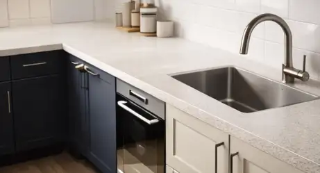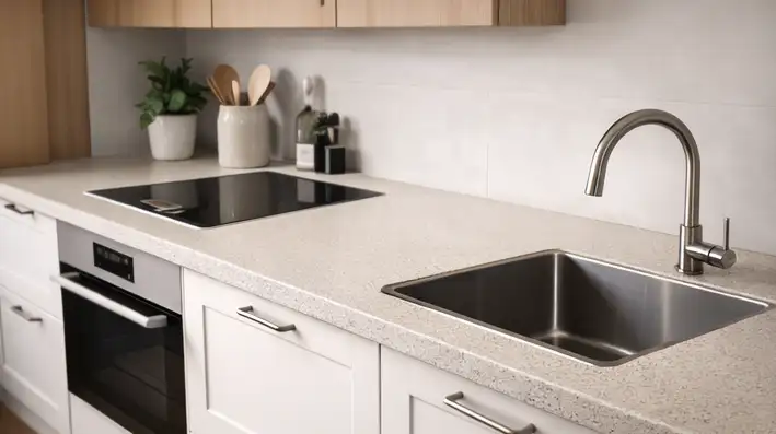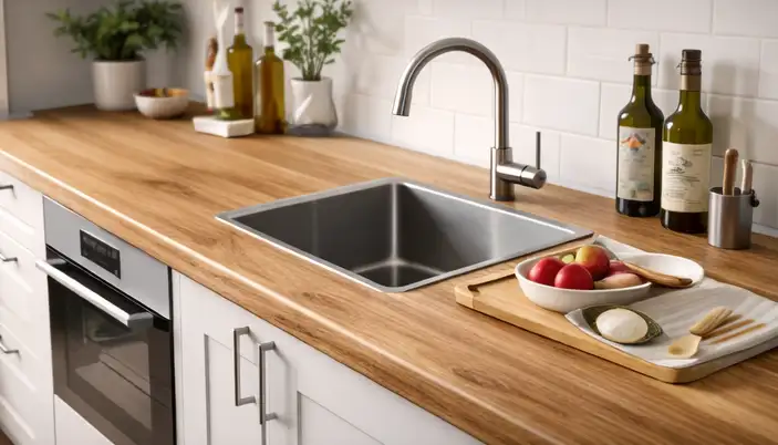 Примечание: для кухни с ежедневной активной готовкой оптимален кварцевый агломерат или акрил. Выбирая ДСП с пластиком ради доступной цены, неизбежно жертвуют долговечностью — вздутие от влаги в районе мойки случается через 5–7 лет.