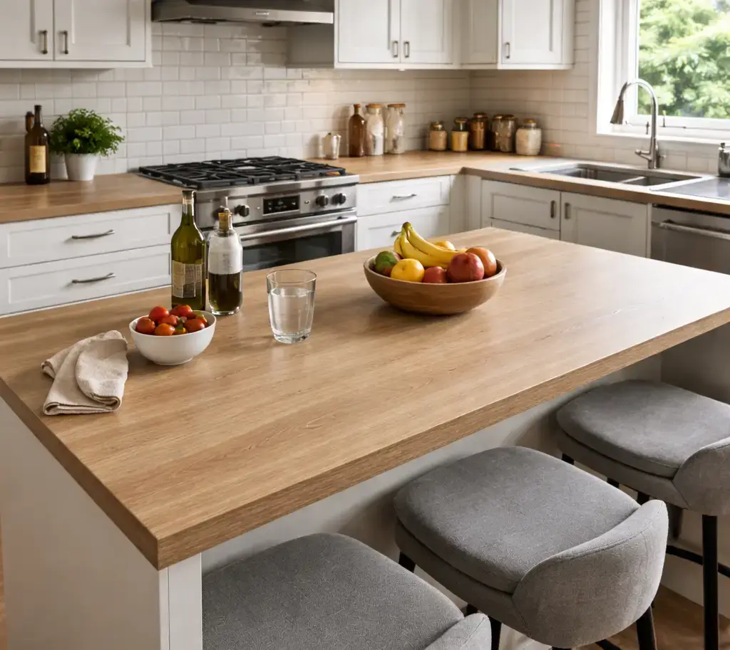 Факт 5. Натуральное дерево на кухне «живёт» своей жизнью. Реагирует на перепады влажности, впитывает запахи и требует обновления масла раз в 3–6 месяцев. Выбор для ценителей тактильности выше практичности.