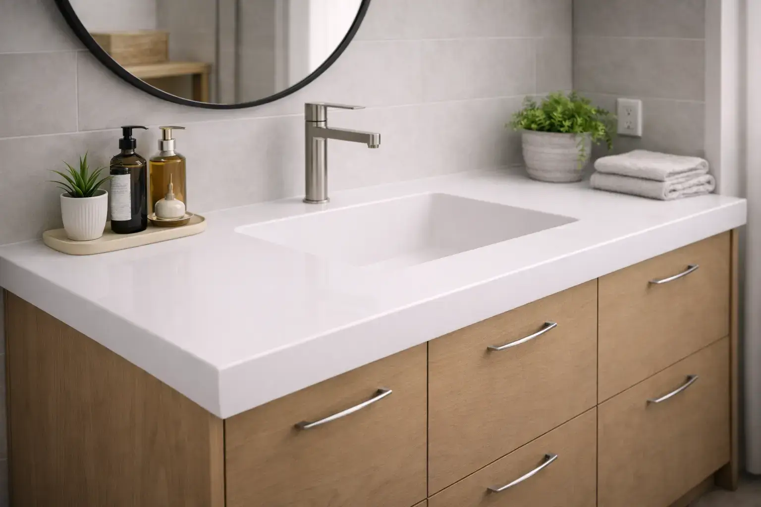 Примечание: для санузла с постоянным контактом с водой и косметикой оптимален акрил. Главное преимущество — бесшовность и реставрация. Выбирая ДСП с пластиком ради цены, неизбежно жертвуют долговечностью — вздутие на торцах и вокруг раковины случается через 3–5 лет без должной герметизации.