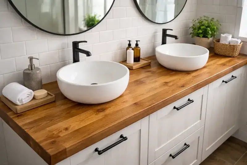 - Точные размеры. Заказать столешницу из лиственницы по индивидуальным размерам — получить поверхность, вписанную в нишу с точными вырезами. В бишкекских домах с нестандартной планировкой это критично.