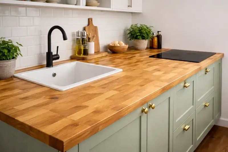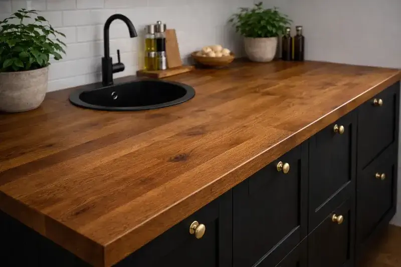 - Экономия в перспективе. Купить столешницу из лиственницы из качественного щита с маслом — вложение на 20–35 лет. Замена дешёвой плоскости каждые 5–7 лет обходится дороже.
