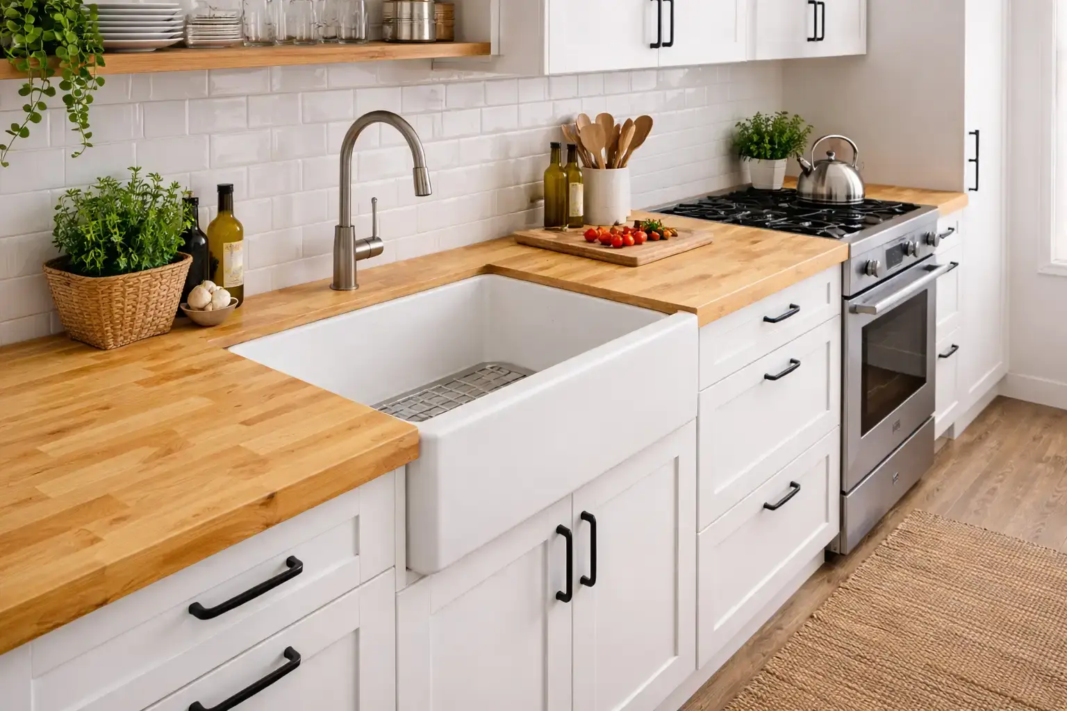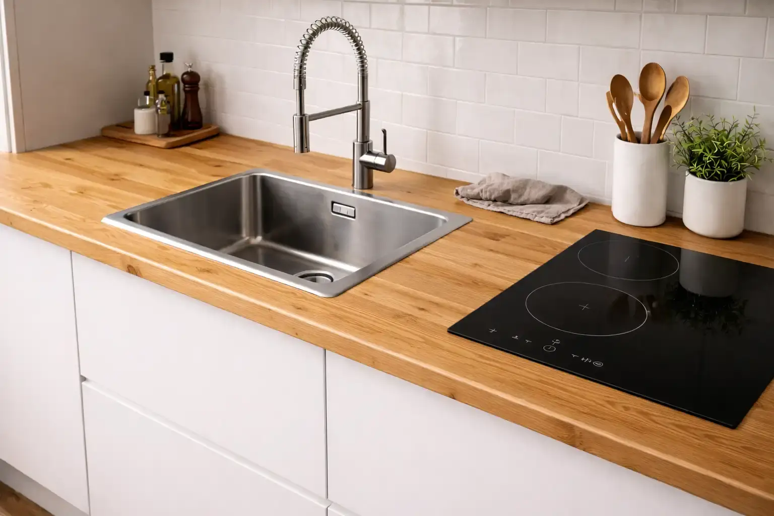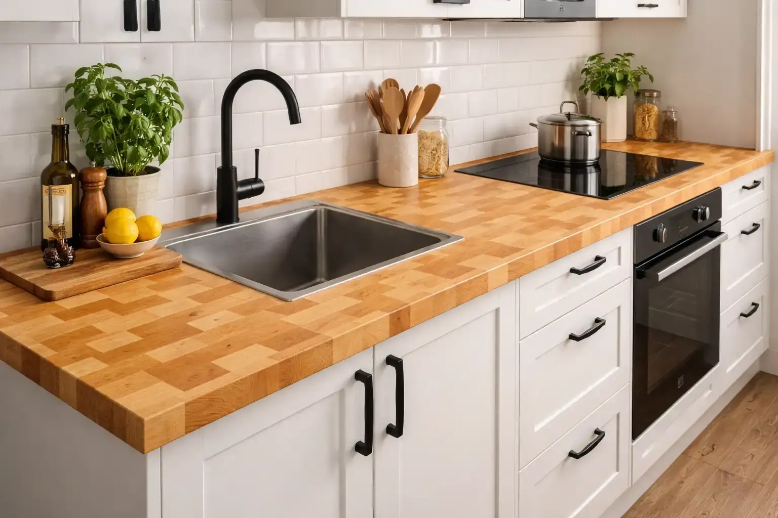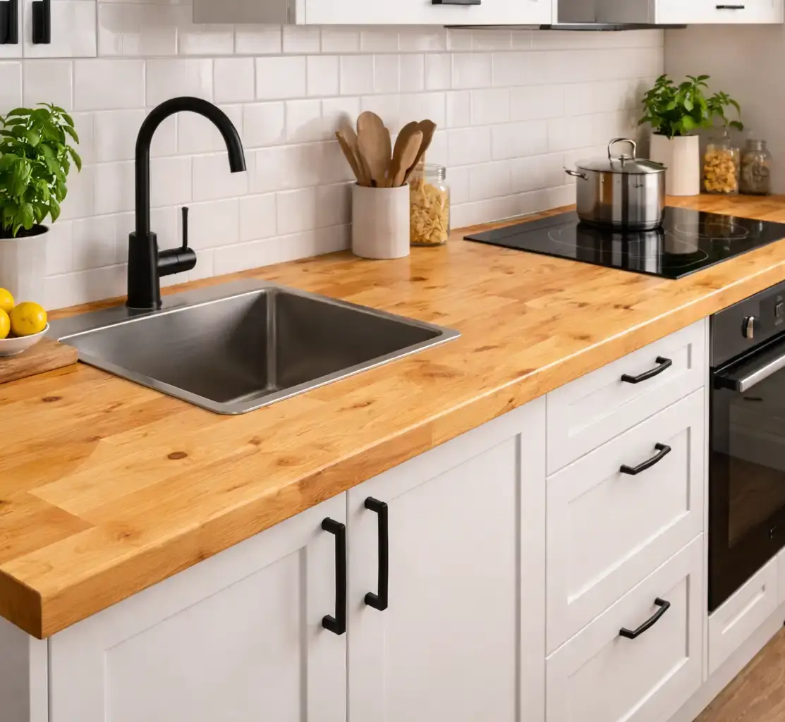 Примечание: для кухонной плоскости оптимален сращенный мебельный щит. Короткие ламели, склеенные на водостойкий клей D4, взаимно компенсируют напряжения и практически не меняют геометрию. Это лучший выбор по соотношению цена/качество/стабильность.