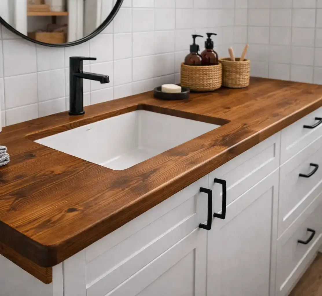 - Точные размеры. Столешница из сосны на заказ вписывается в нишу с точными вырезами под мойку и панель. В бишкекских домах с нестандартной планировкой это критично.