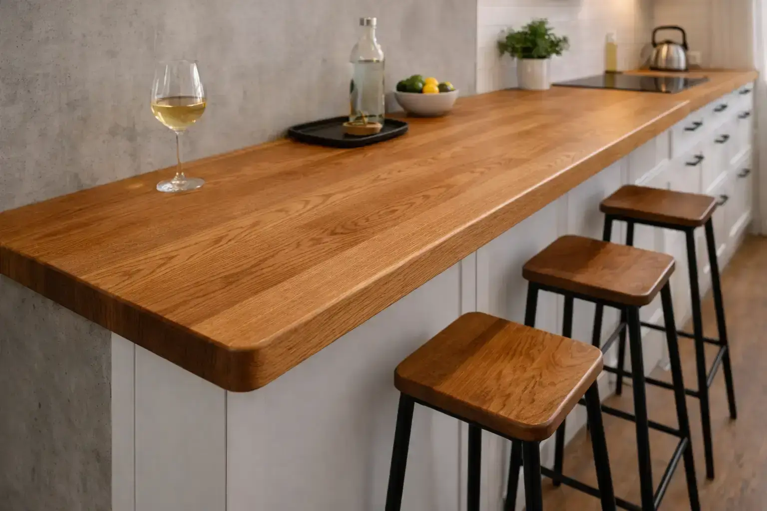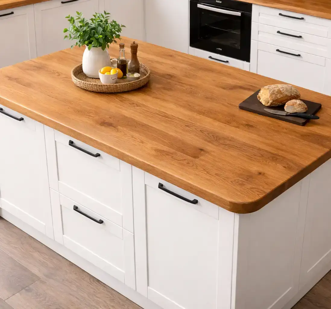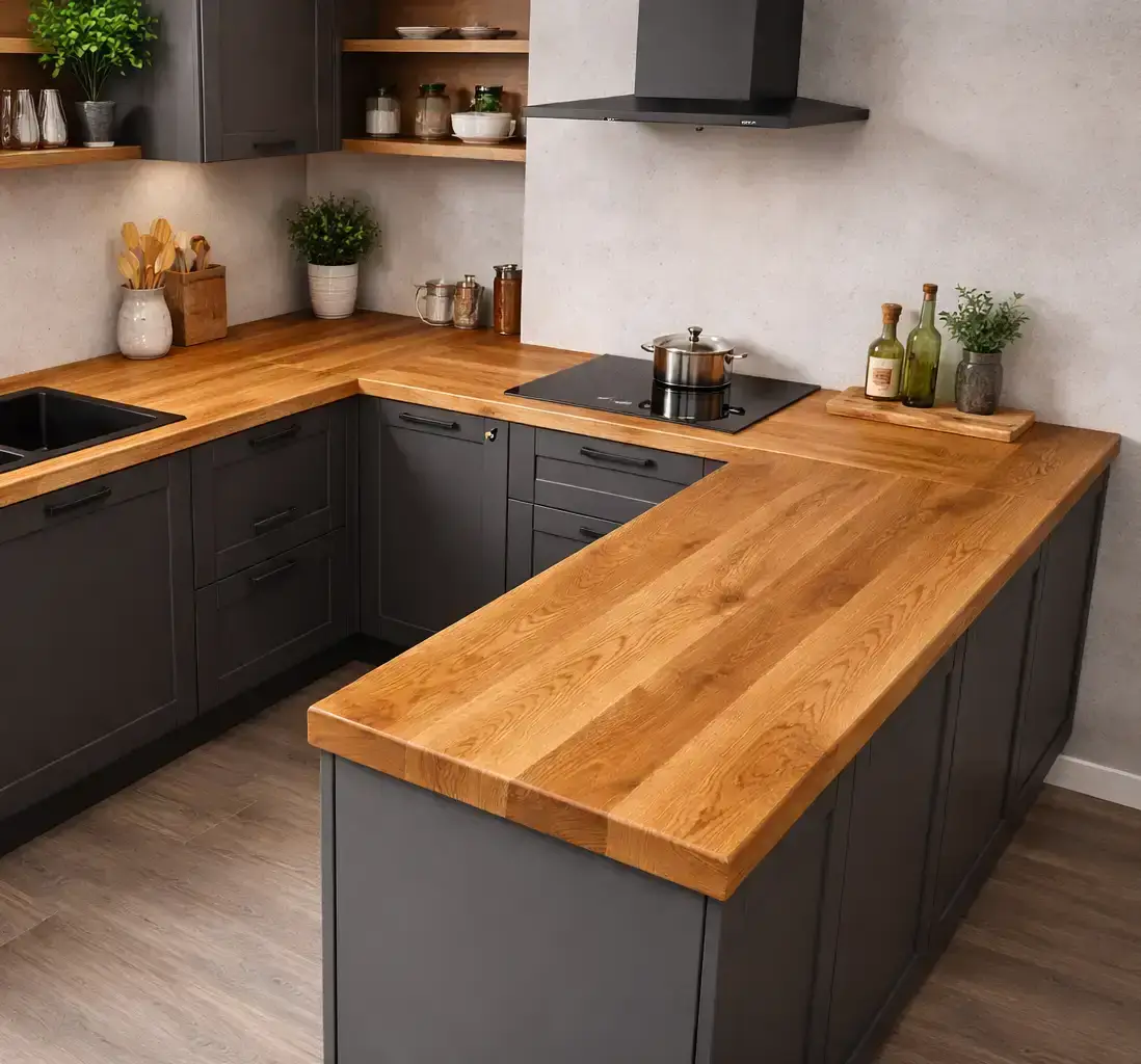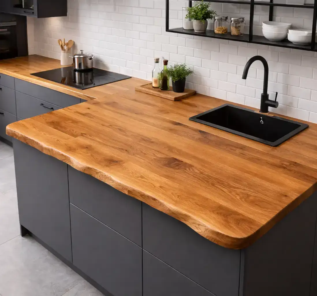 Персональный проект учитывает геометрию, эстетические предпочтения и интенсивность эксплуатации. Качественный сращенный или цельноламельный щит, правильное масляное покрытие и грамотный монтаж с компенсационными зазорами гарантируют службу 25–40 лет, становясь только красивее. Стартовая цена выше, чем у ДСП с пластиком или сосны, но замена дешёвой плоскости каждые 5–7 лет и отсутствие тактильного удовольствия от благородного материала обходятся дороже.