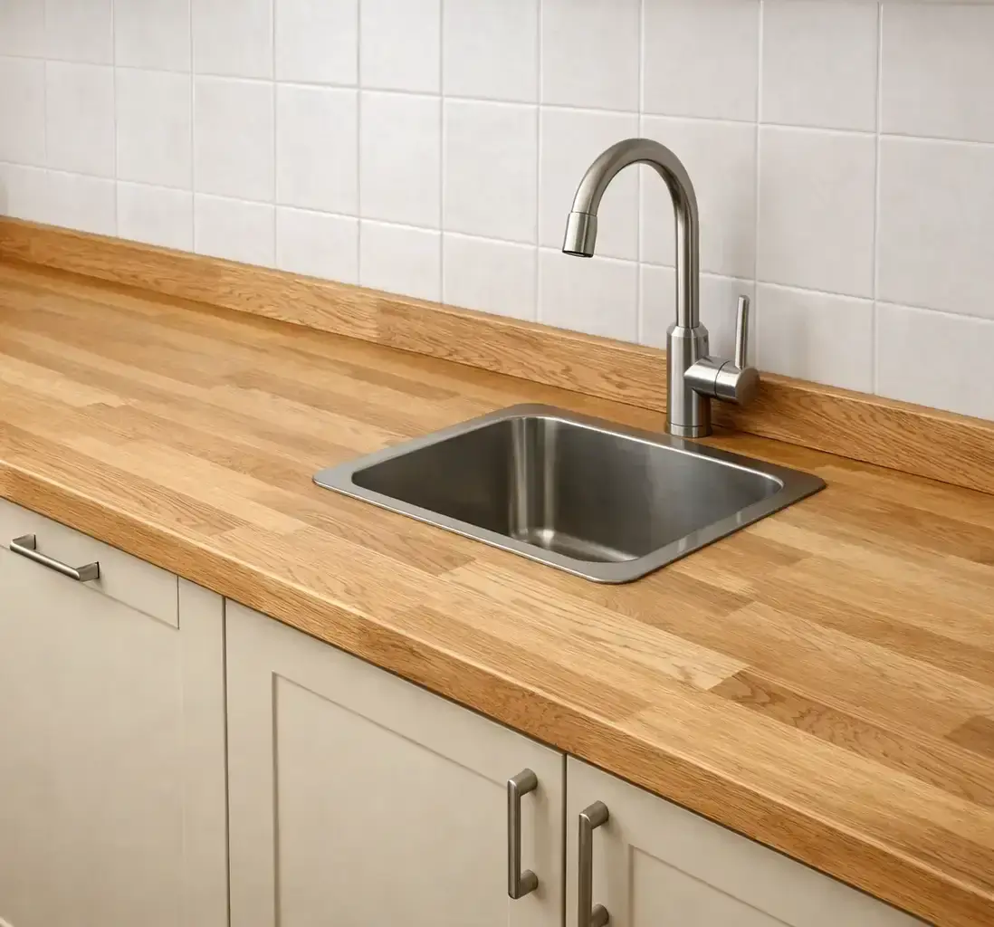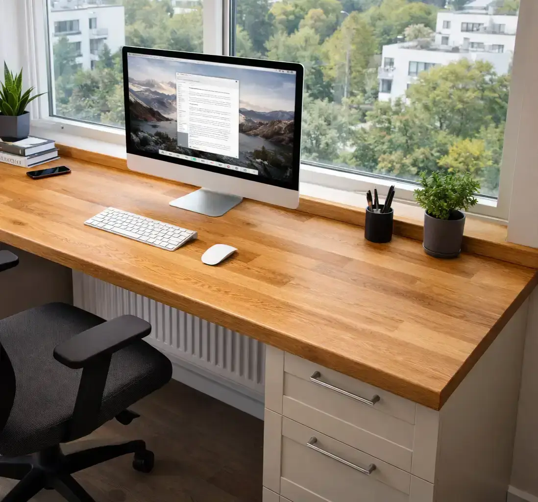 - Точные размеры. Заказать столешницу из ясеня по индивидуальным размерам — получить поверхность, вписанную в нишу с точными вырезами. В бишкекских домах с нестандартной планировкой это критично.
