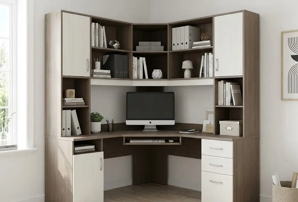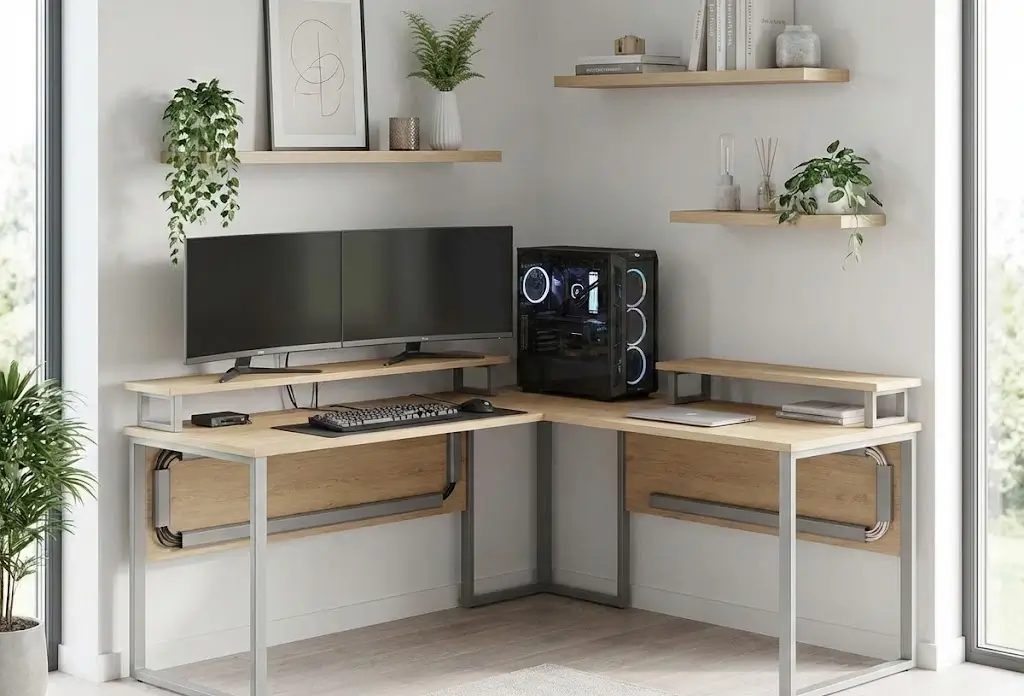 Грамотная организация углового рабочего места позволяет разместить всё необходимое в зоне лёгкой досягаемости, не загромождая основную поверхность. Ключевой принцип — разделение зон: монитор и клавиатура в центре, документы и периферия по бокам.