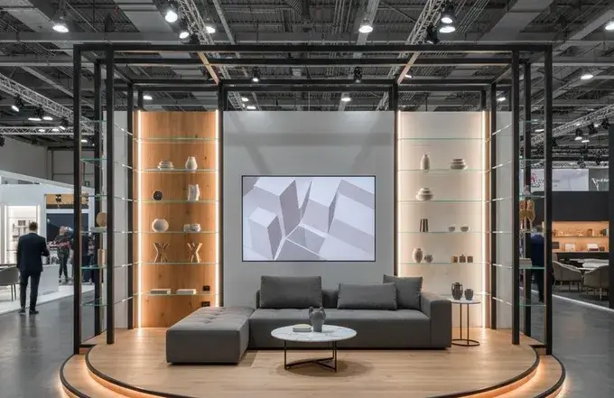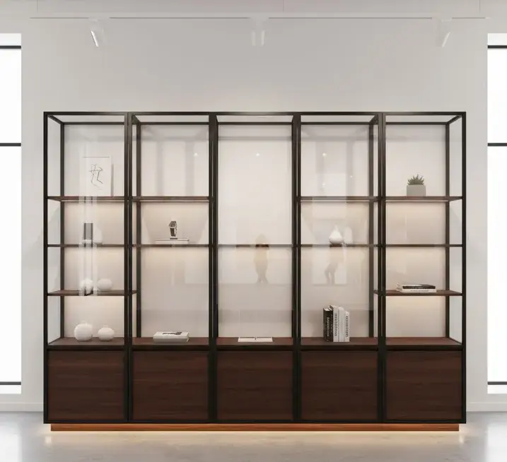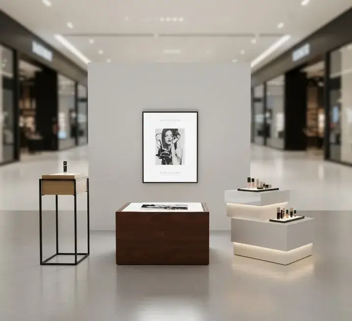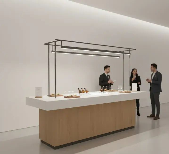 Этап 3 — дизайн-проект и 3D-визуализация. Строится модель зала с расстановкой, утверждаются материалы, цвета, тип подсветки. На этом этапе согласуются технологические отверстия под кабель-каналы — перенести розетку на визуализации стоит десять минут дизайнера, а в уже смонтированной витрине это дыра, которую не скрыть.