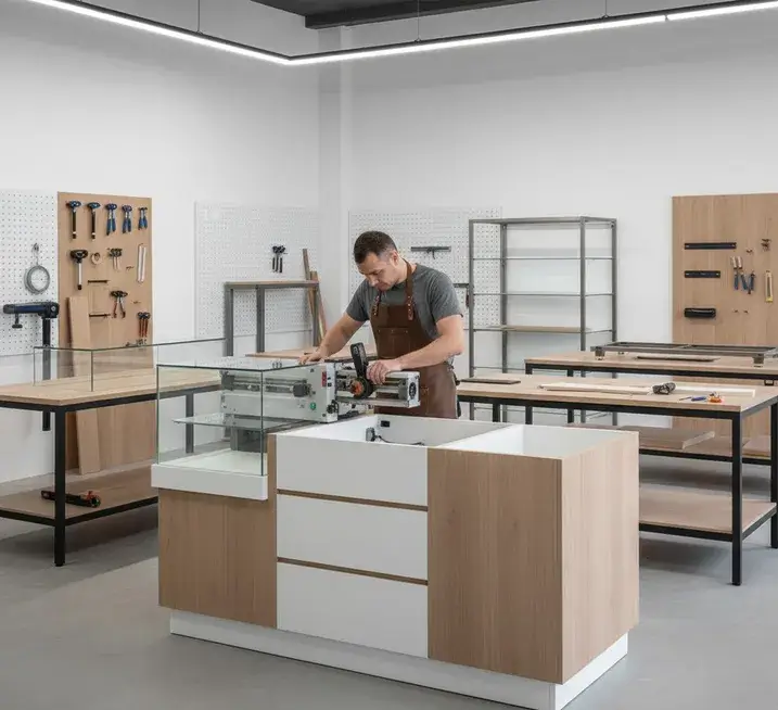 Отдельная история — ремонтопригодность. Готовый стеллаж при поломке полки или износе фасада меняется целиком, а простой витрины в торговом зале — это прямой убыток. При профессиональном производстве торгового оборудования мы закладываем модульную архитектуру: повреждённый элемент демонтируется и заменяется за час, без эвакуации всей секции.